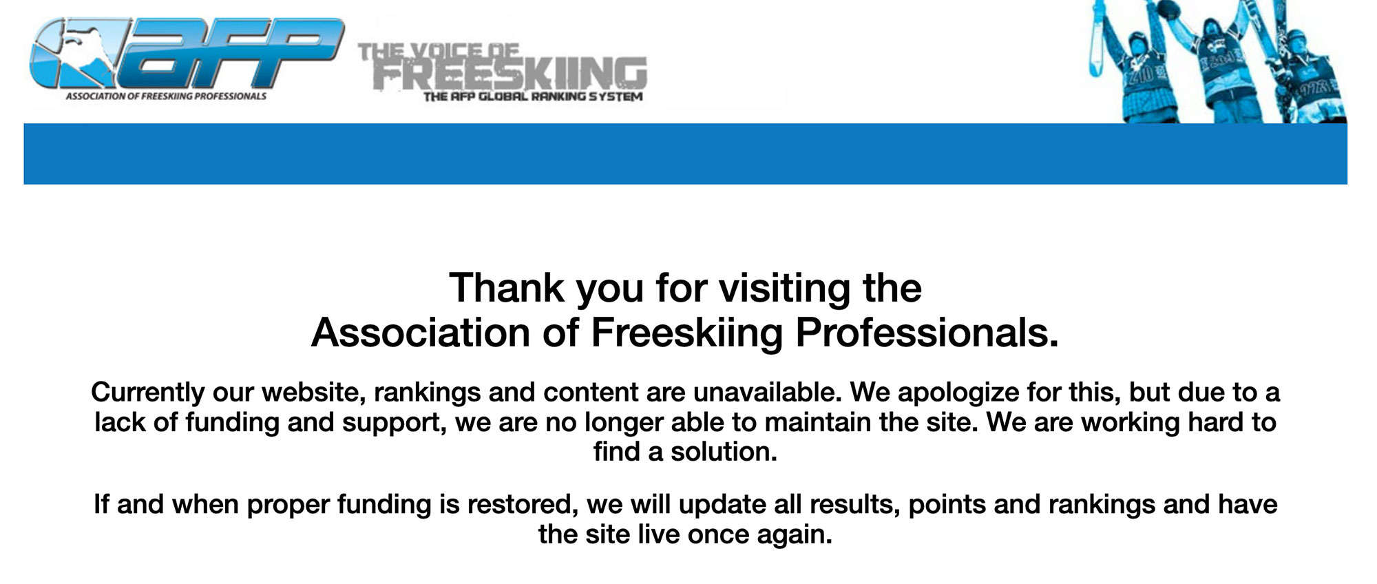 Whether or not you paid much attention to them, the AFP was always there with freeskiing’s “official” rankings — until all of a sudden, they weren’t anymore. Visit the home page of the AFP today, and you’ll be greeted with this message: “Currently our website, rankings and content are unavailable. We apologize for this, but due to a lack of funding and support, we are no longer able to maintain the site. We are working hard to find a solution.”