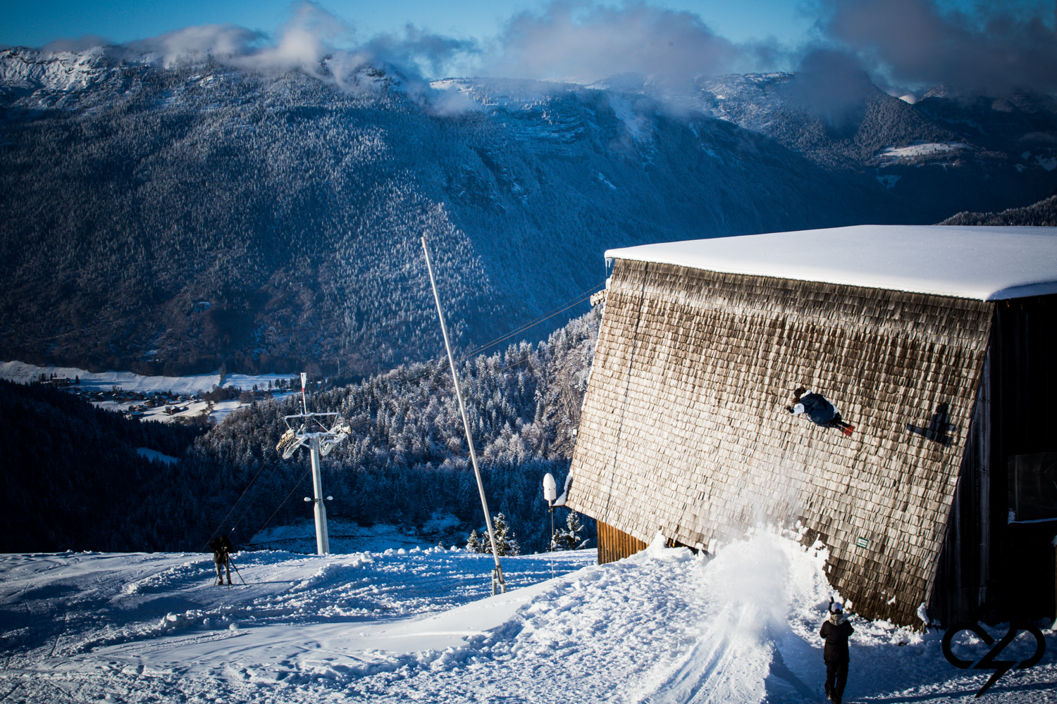 At 10am the first filmer, Maxime Ramoul, arrives. We fill the car, pick up the second filmer and join the skiers. At eleven the spot is shaped and the skiing is about to start, and also about to end. I know what you’re thinking: something bad happened. but that wasn’t it. Cesar called it quits after crashing twice, and David nailed it twice, once to forward and once to switch. “I don’t want to stay too long on this one,” he said.