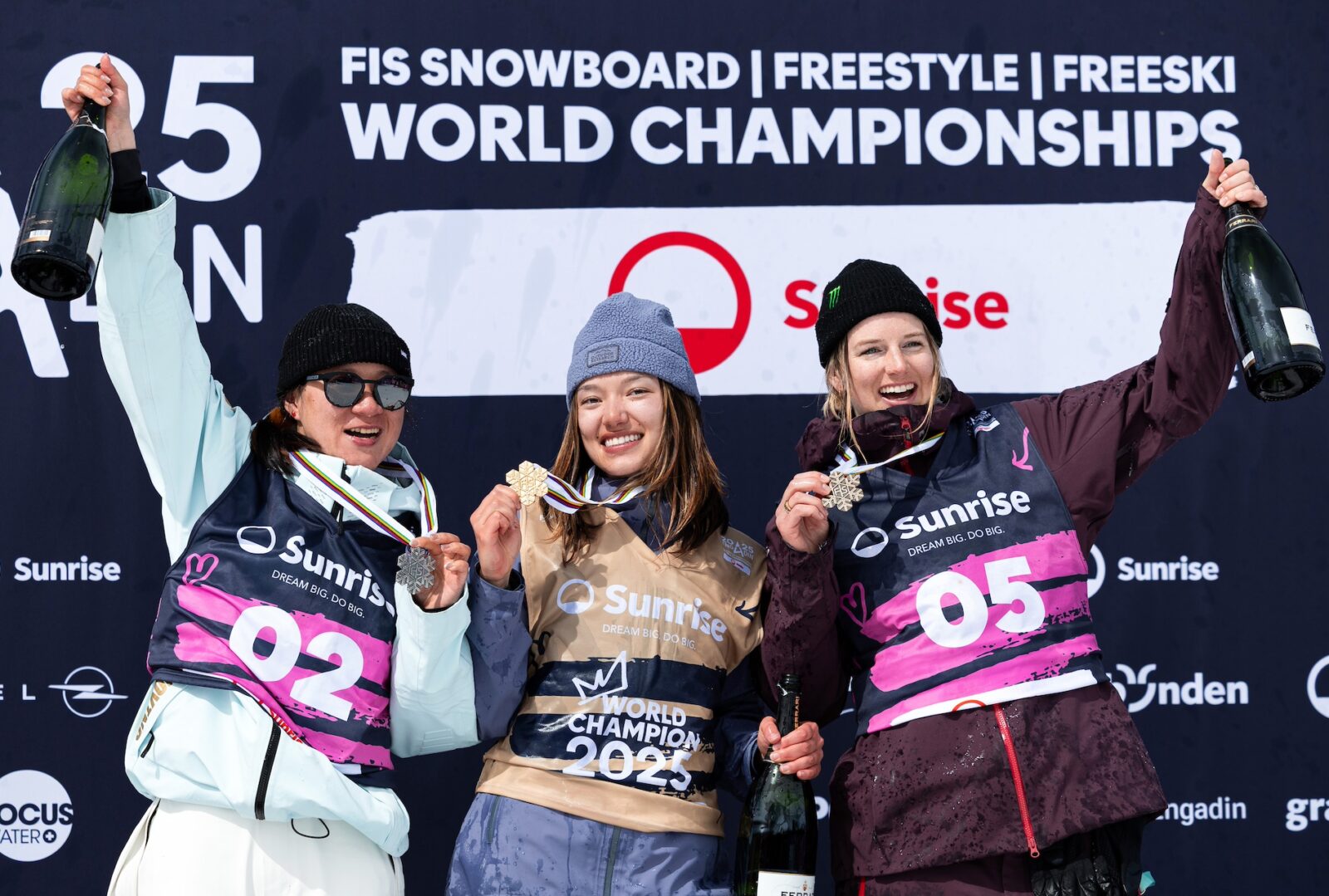 Final women’s podium: Zoe Atkin in first place, Fanghui Li in second place and Cassie Sharpe in third.