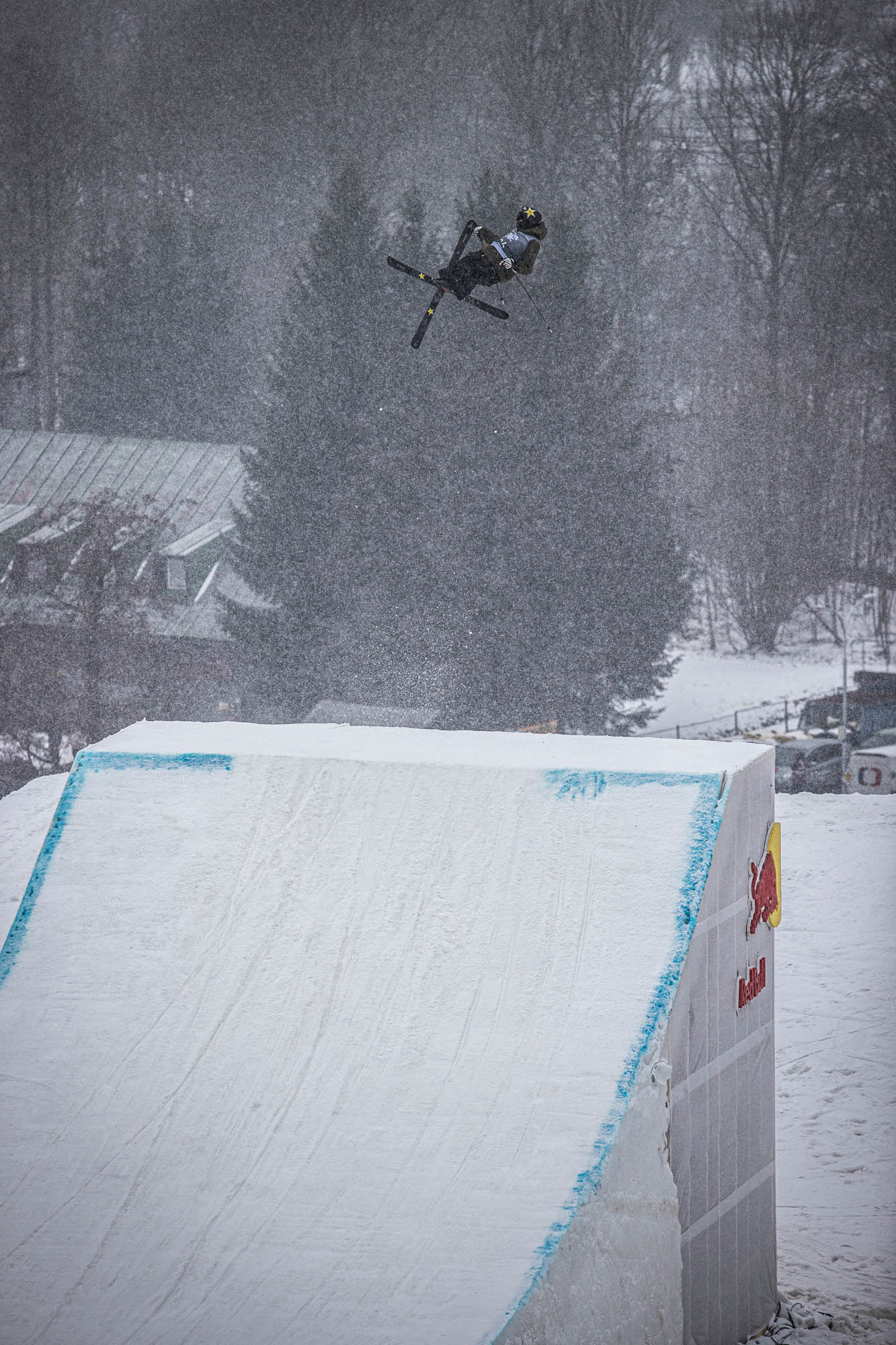 The weather didn’t really cooperate this year. Snow conditions in Destne were some of the worst in a decade, and the struggle was real for the shapers to build a massive kicker. Fortunately, some cold days came right in time to make enough artificial snow for the landing. When all the riders arrived for the first training day, heavy rain and warm winds shut down the session. The training was rescheduled to Thursday, when the clouds rolled out and the crew finally had a nice session on this lofty booter. For me, the highlight was a switch triple cork 1260 screaming seamen mute grab from infamous big air guru Elias Syrja (FIN).