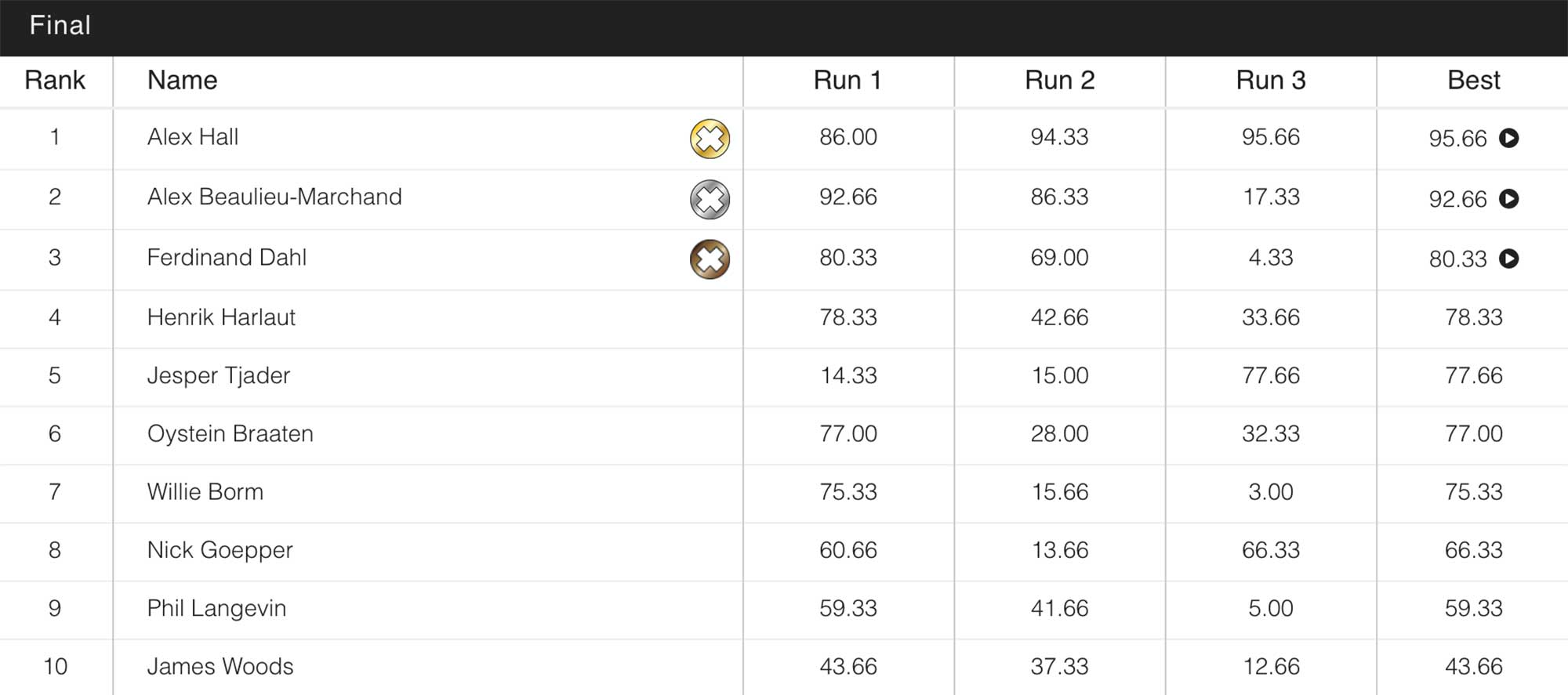 It’s a huge win for Alex Hall, a much-hyped skier’s favorite who now, like many before him, must assume the mantle of a big dog. If his performance today is any indication, we can look forward to a lot more great slopestyle runs from him in the near future.