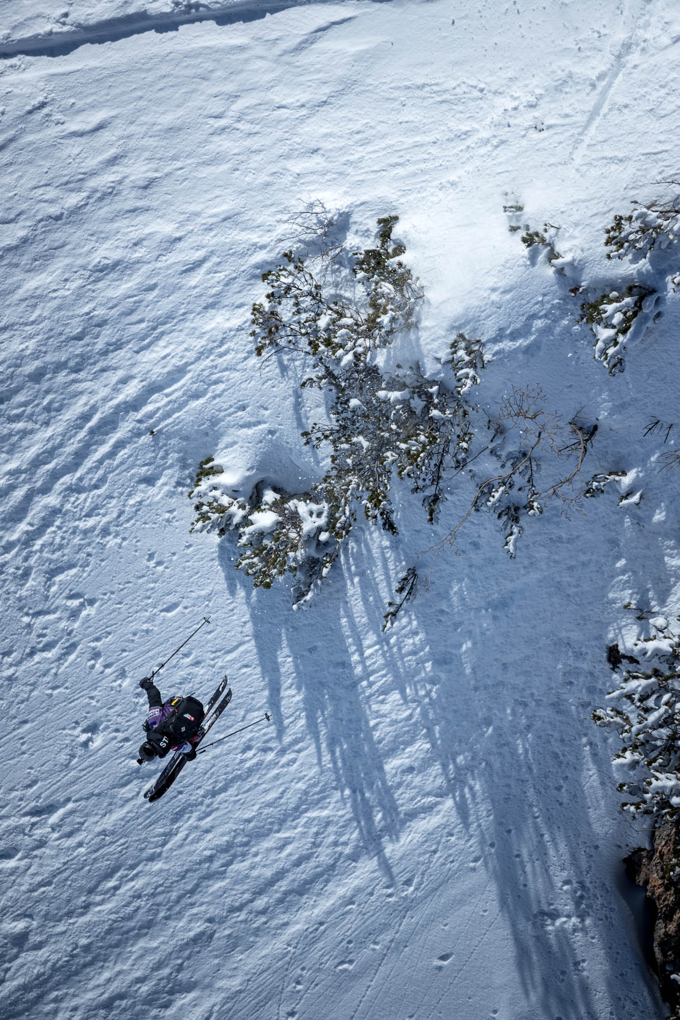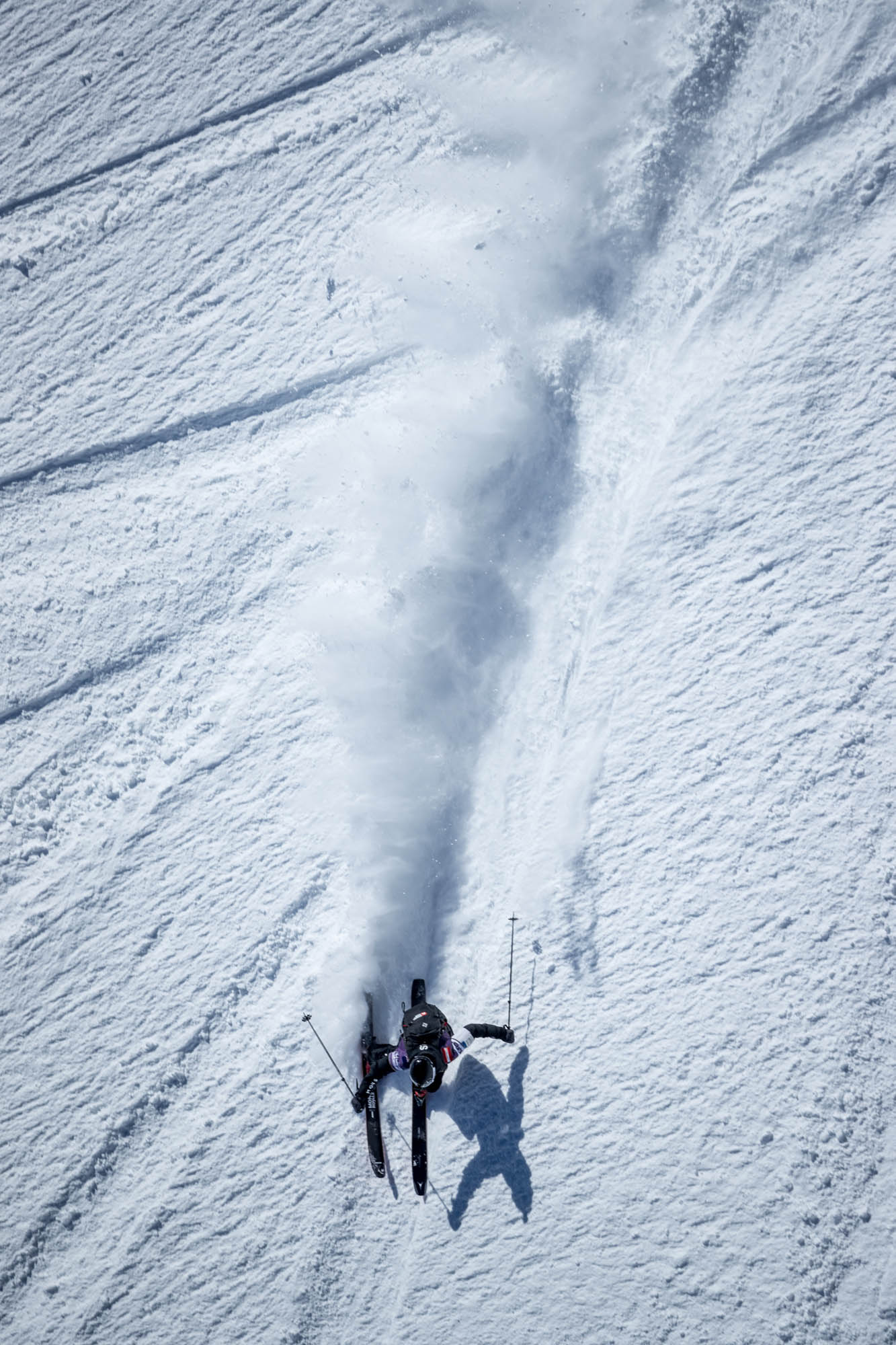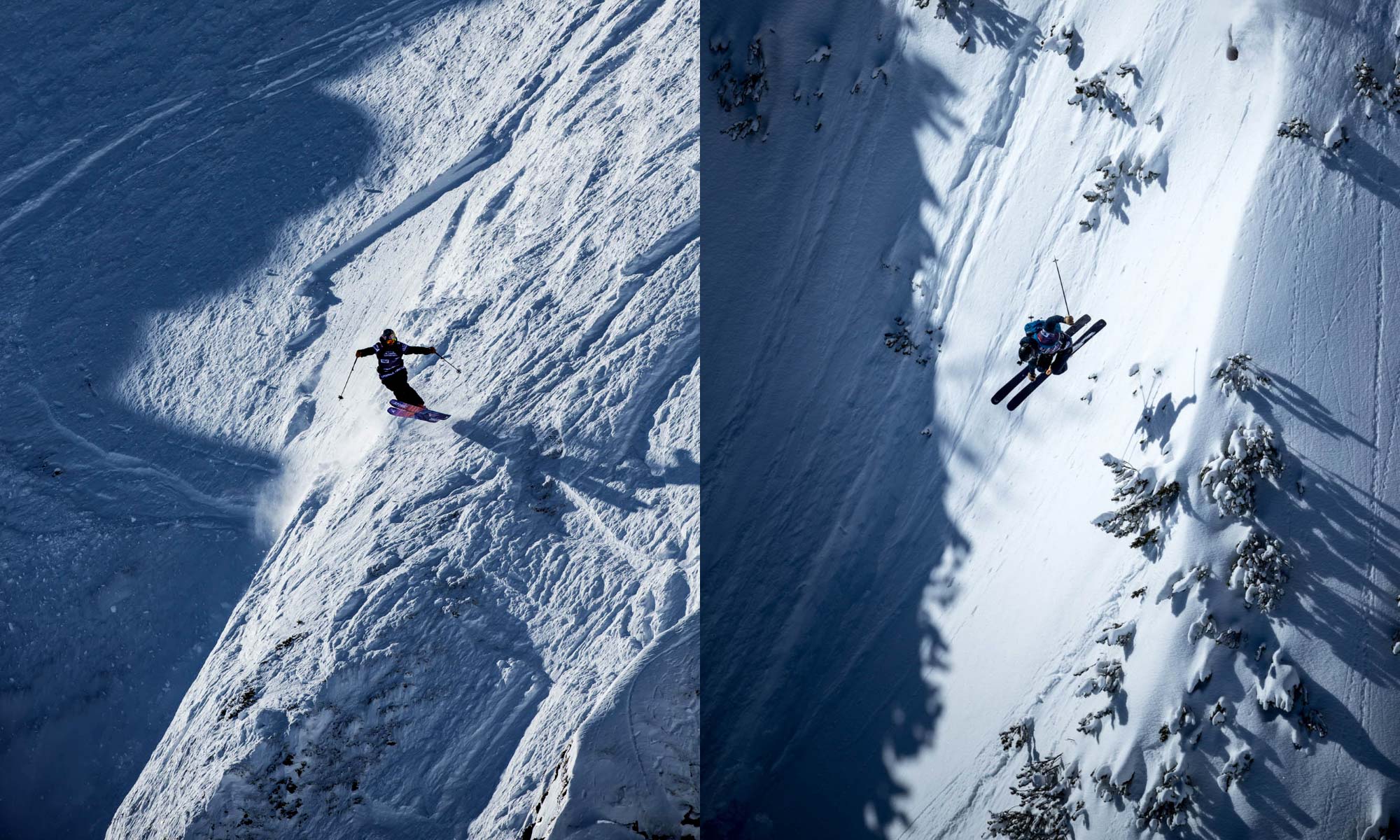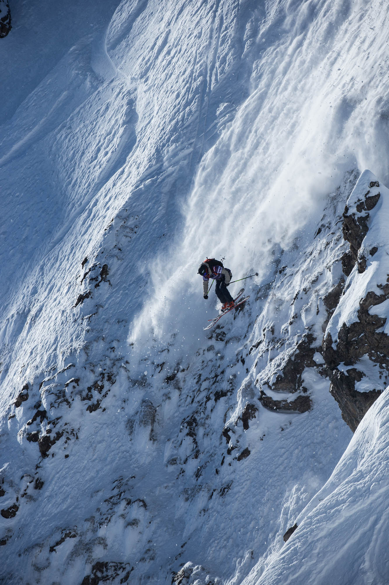 Shaking up the leaderboard, overall leader Kristofer Turdell got caught up on some branches near the bottom of his run and crashed. He still finished, but in 17th place, losing the points lead as a result. Tao Kreibich transfer gapped from one couloir to another, a bold move that landed him in fifth place. Leo Slemett crashed after backflipping into a couloir, and Aymar Navarro linked some enormous features but took a slam after a high-speed double. Yu Sasaki and Ivan Malakov went back-to-back on the biggest cliff on the face.