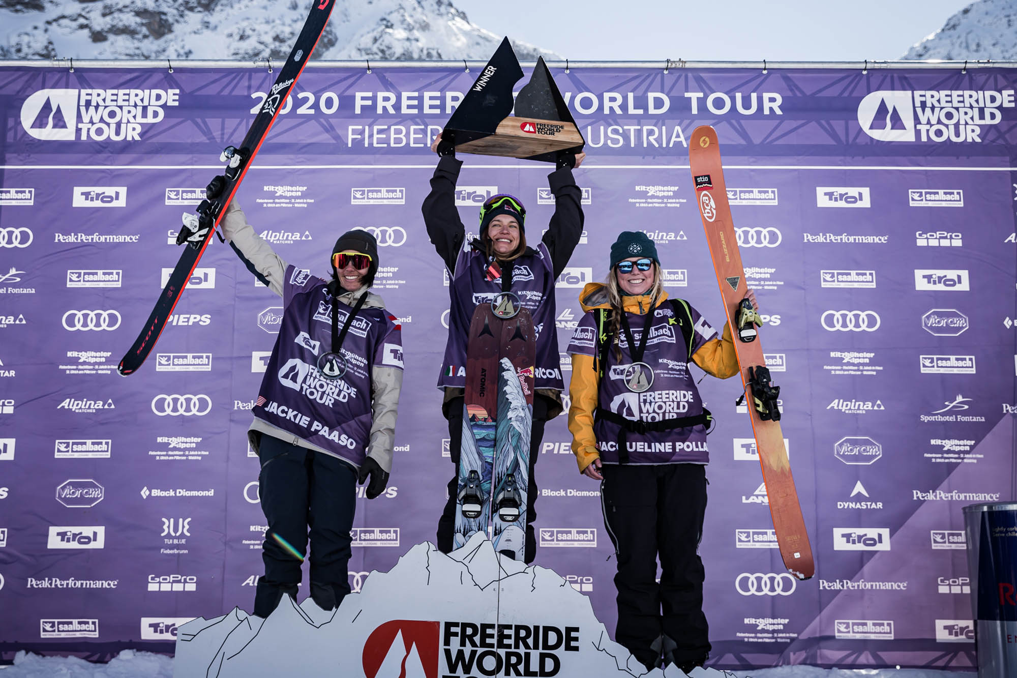 The 2020 Fieberbrunn women´s ski podium: Arianna Tricomi, Jackie Paaso, Jacqueline Pollard. Photo: Dom Daher/FWT