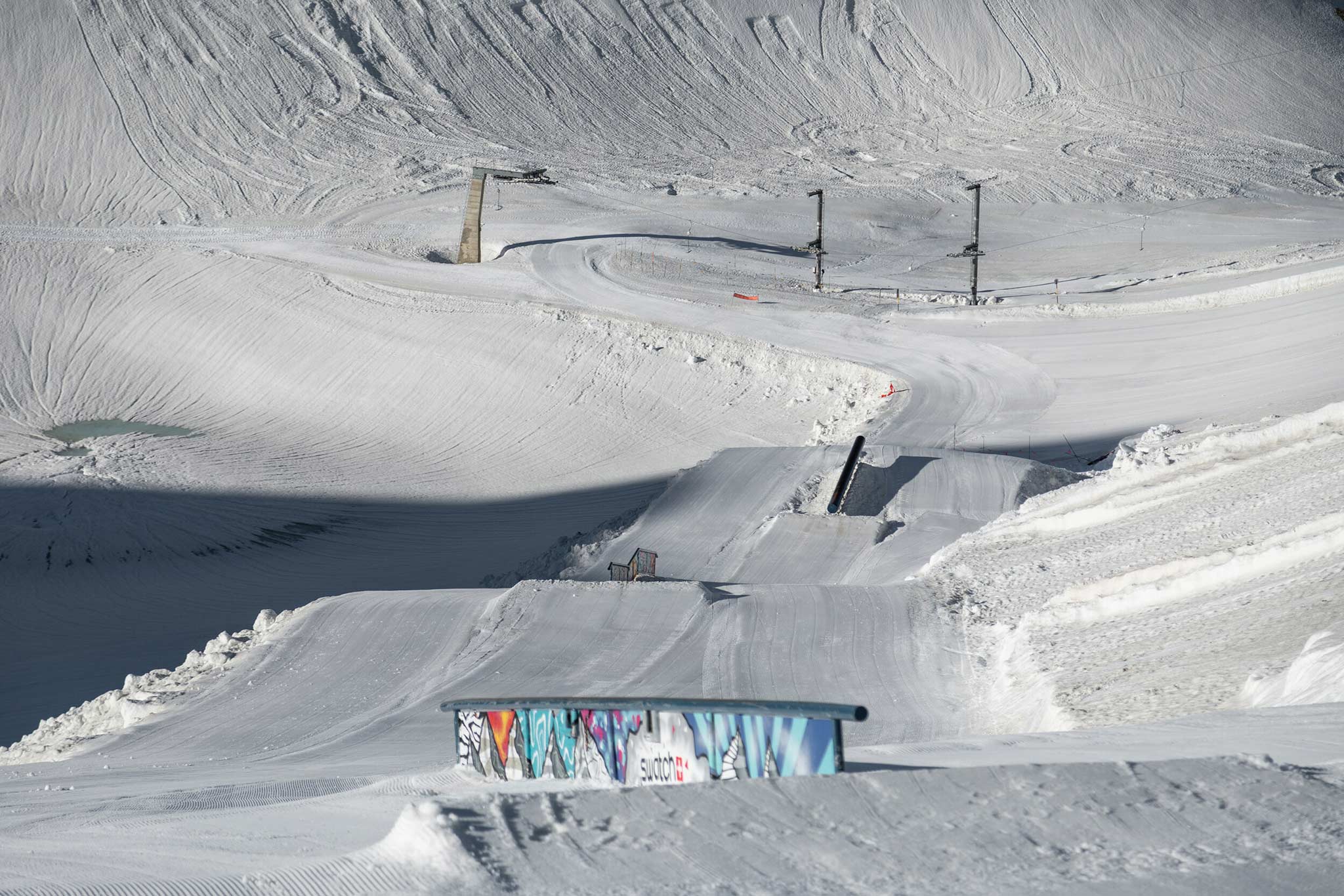 The setup is the same as the one that the Swiss ski and snowboard teams got to session a few weeks ago, with a six-feature rail line and a two-jump line. "Expect some fast lift laps and a ton of slushy good spring skiing," CM says.
