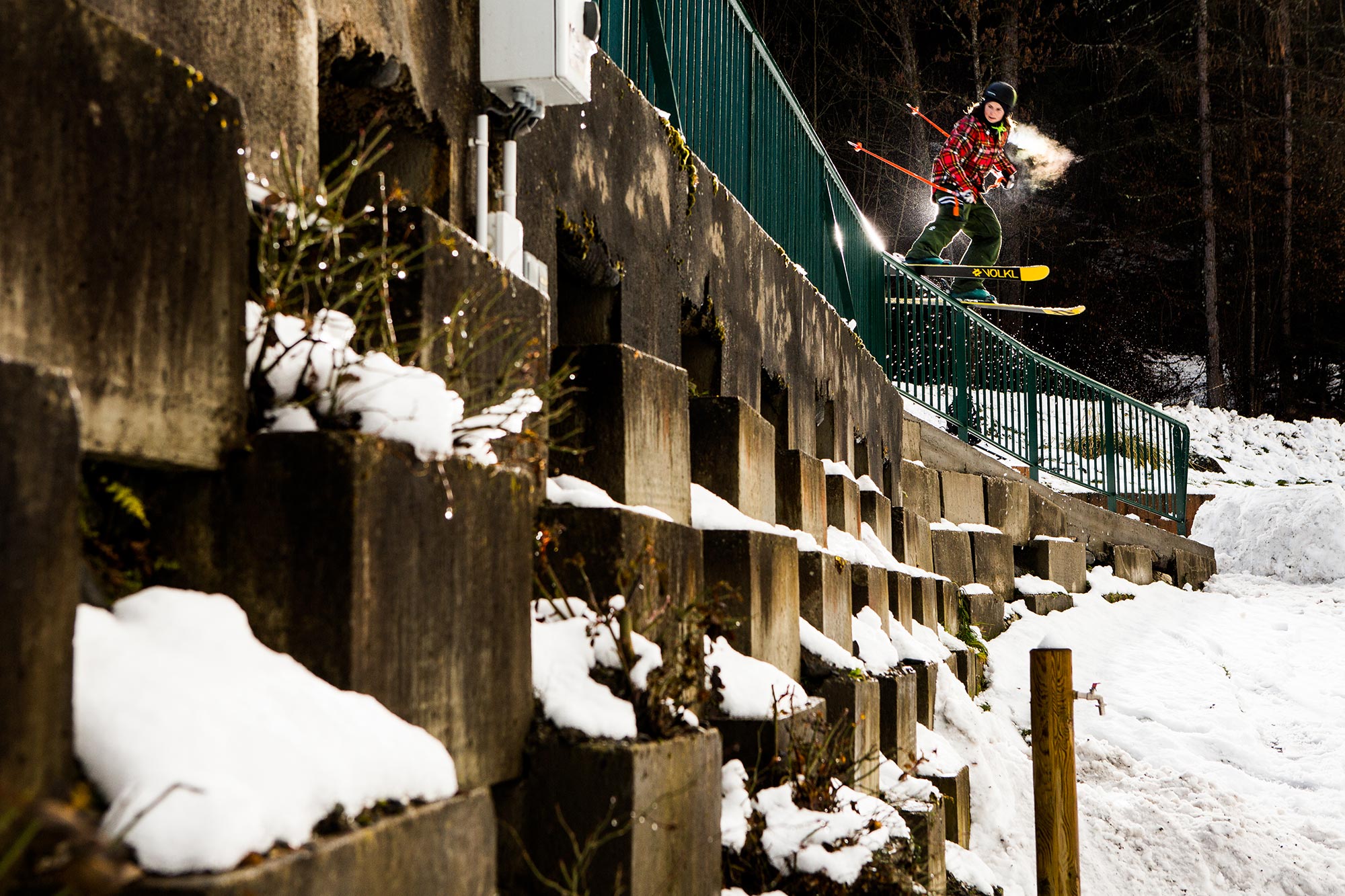 Saint Nicolas La Chapelle, Savoy. The spot is by a church, above a calm cemetery and in front of skeptical students. For three hours we’ve been onsite, in a snowfall that's eventually turned to rain. Totally drenched, Coline has attempted the feature some 30-odd times already, and keeps pressing on with a determination reminiscent of urban-skiing innovator Cam Riley. She won’t give up, and long after we’ve all given up on the spot, she finally nails it. I’ve already put my camera away due to the weather, and am busy balancing a shovel over my head as a makeshift umbrella. Erwan, meanwhile, has put a protective bag around his camera and continues to film. Finally we yell, jump for joy, and show Coline the video.