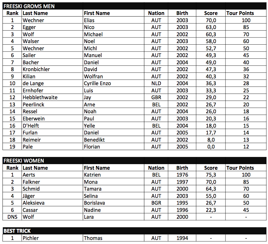 Only the results of the Freeski Women looked slightly different nation-wise. Belgian shredqueen Katrien Aerts won this category with a Lipslide Rightside 3 and a Leftside 3 Air, ahead of the two Austrians Mona Falkner and Tamara Schmid.