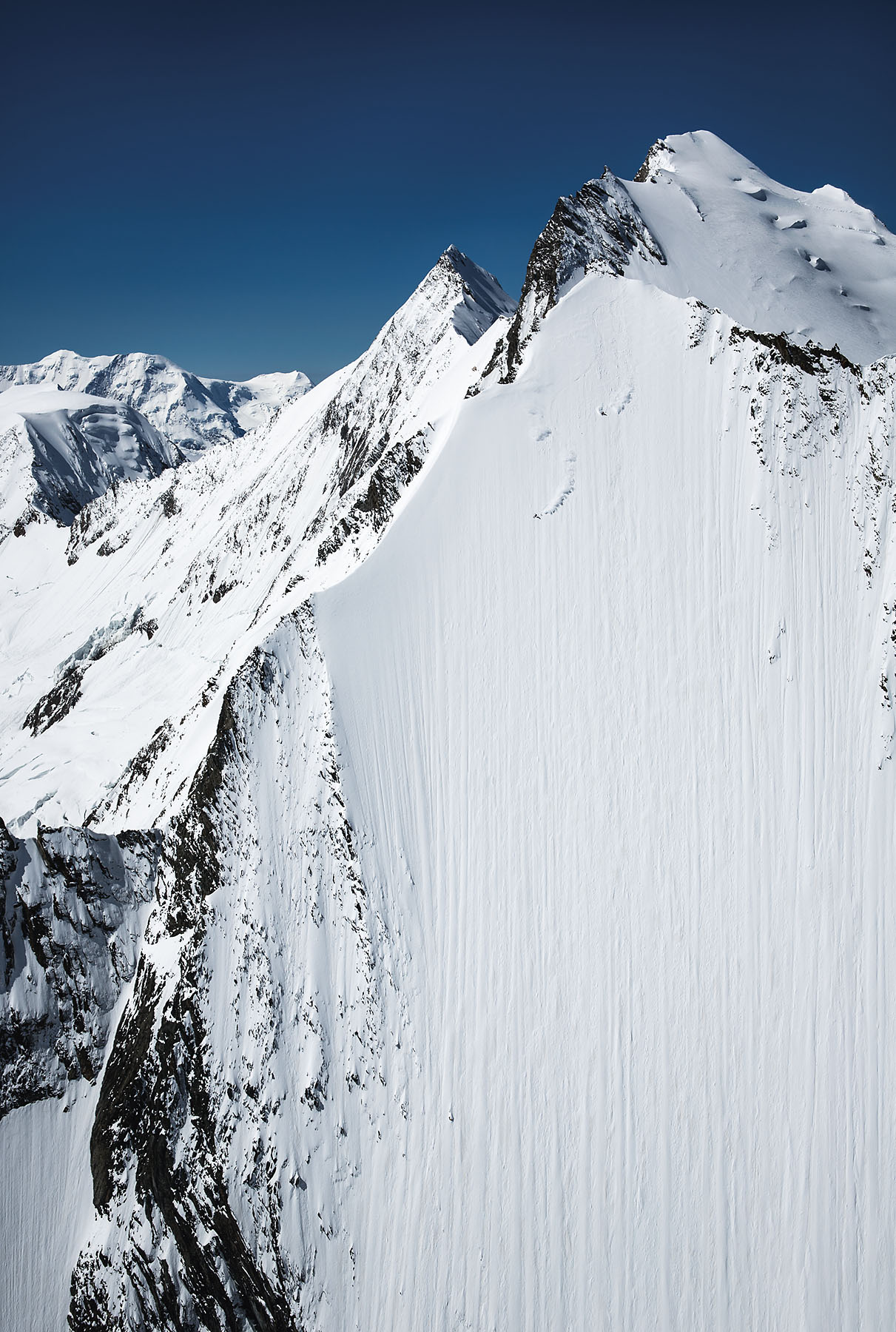 The face is steep right from the beginning and incredibly impressive, not to mention quite exposed above Saas-Fee. Yet again we had unbelievable luck that the conditions were exactly right for our project when we went there and we were able to really enjoy the descent.