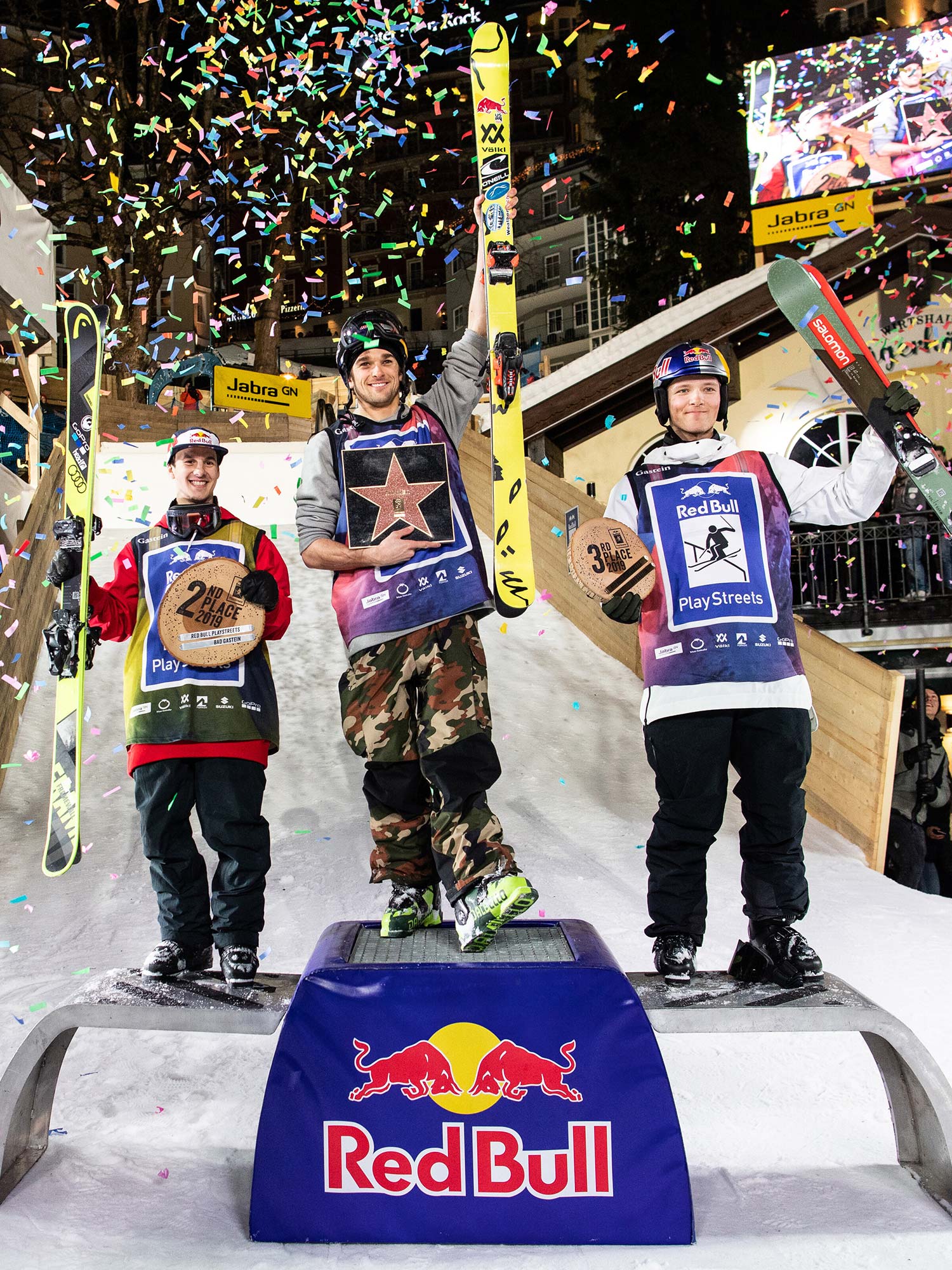 2019 Red Bull Playstreets podium: Nick Goepper (1st), Jesper Tjäder (2nd), Oscar Wester (3rd) Photo: Philipp Greindl/Red Bull Content Pool