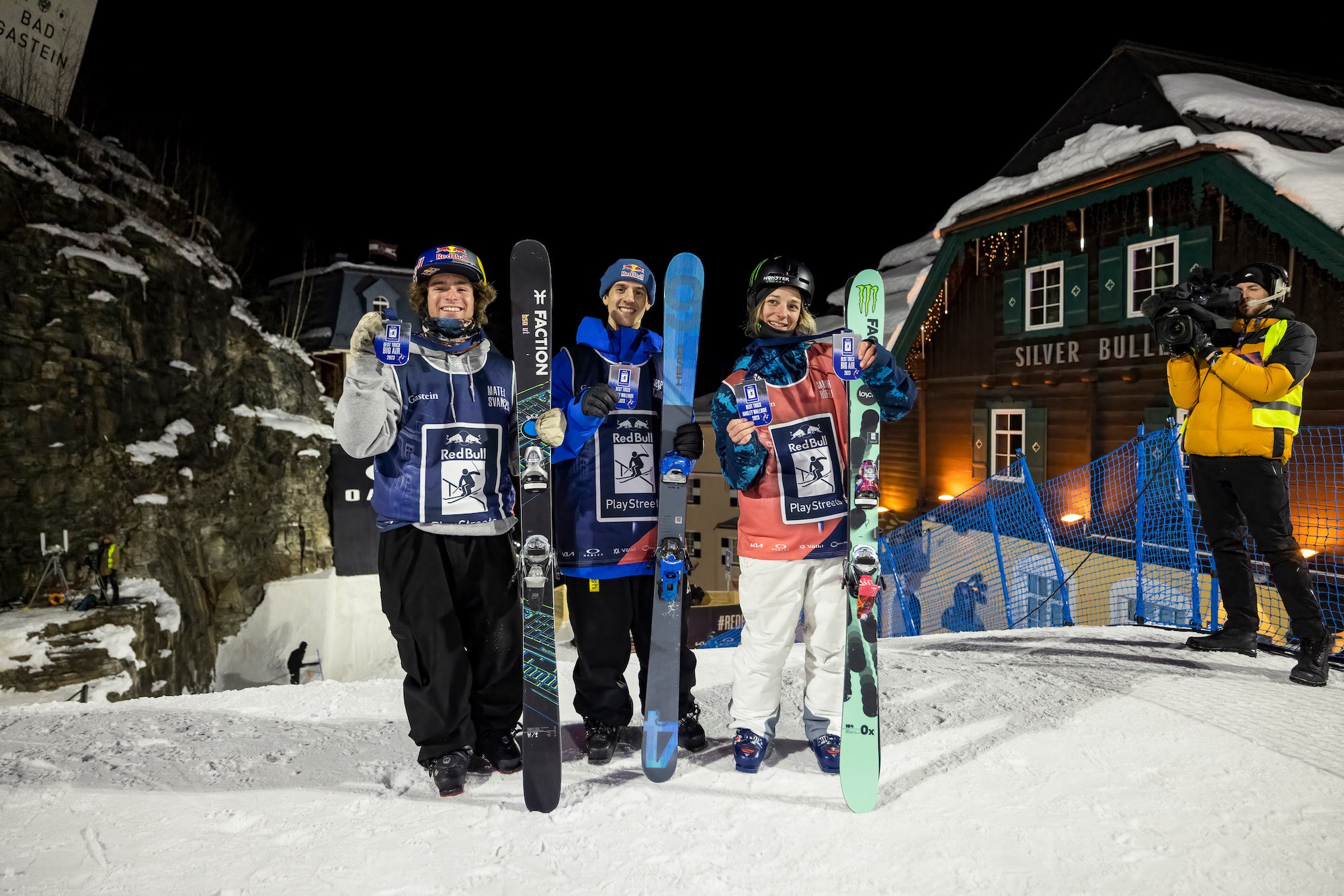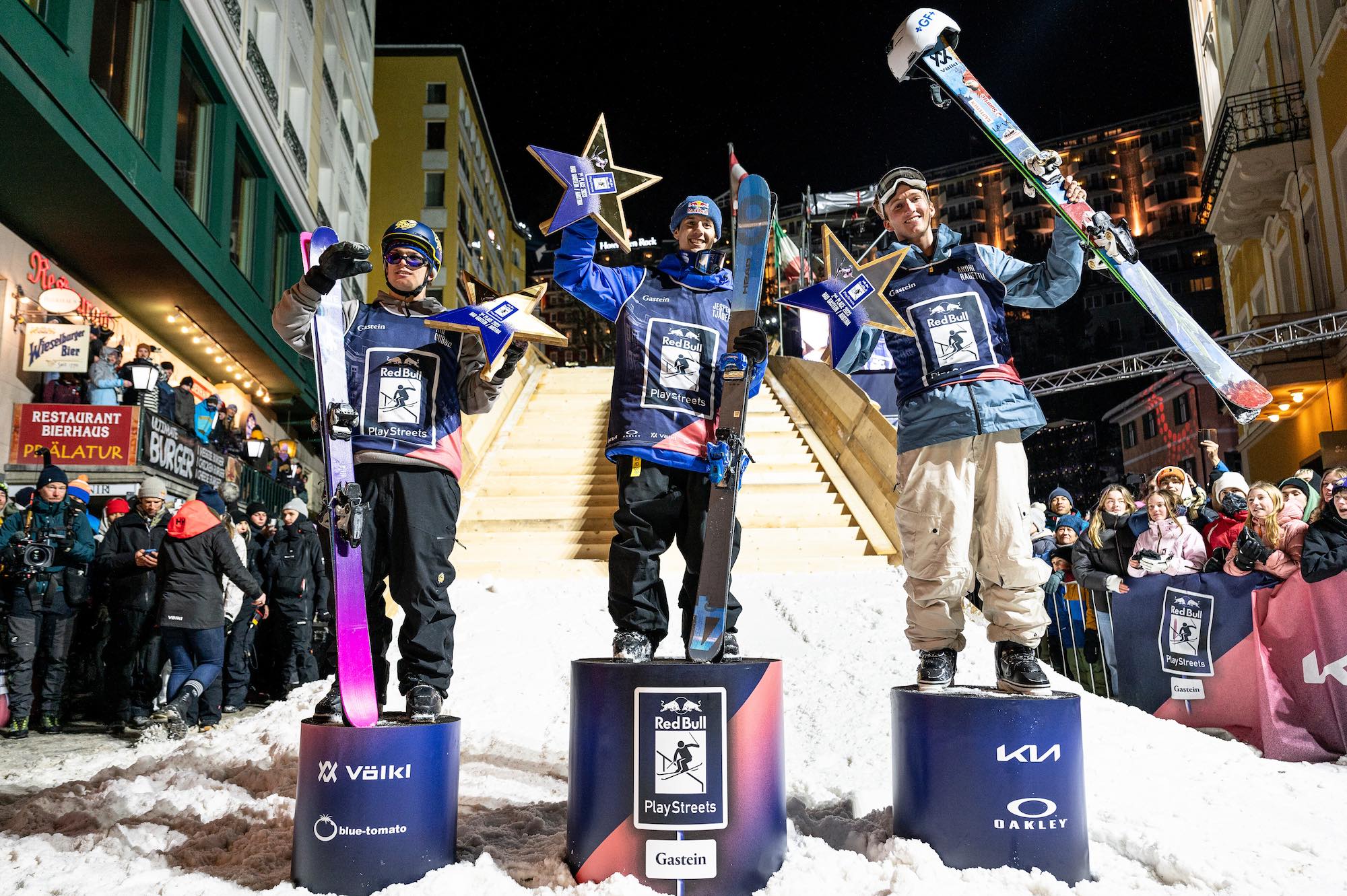 Red Bull Playstreets 2023 podium: Jesper Tjäder (1st), Andri Ragettli (2nd), Kim Gubser (3rd). Photo: Miriam Lottes/Red Bull Content Pool