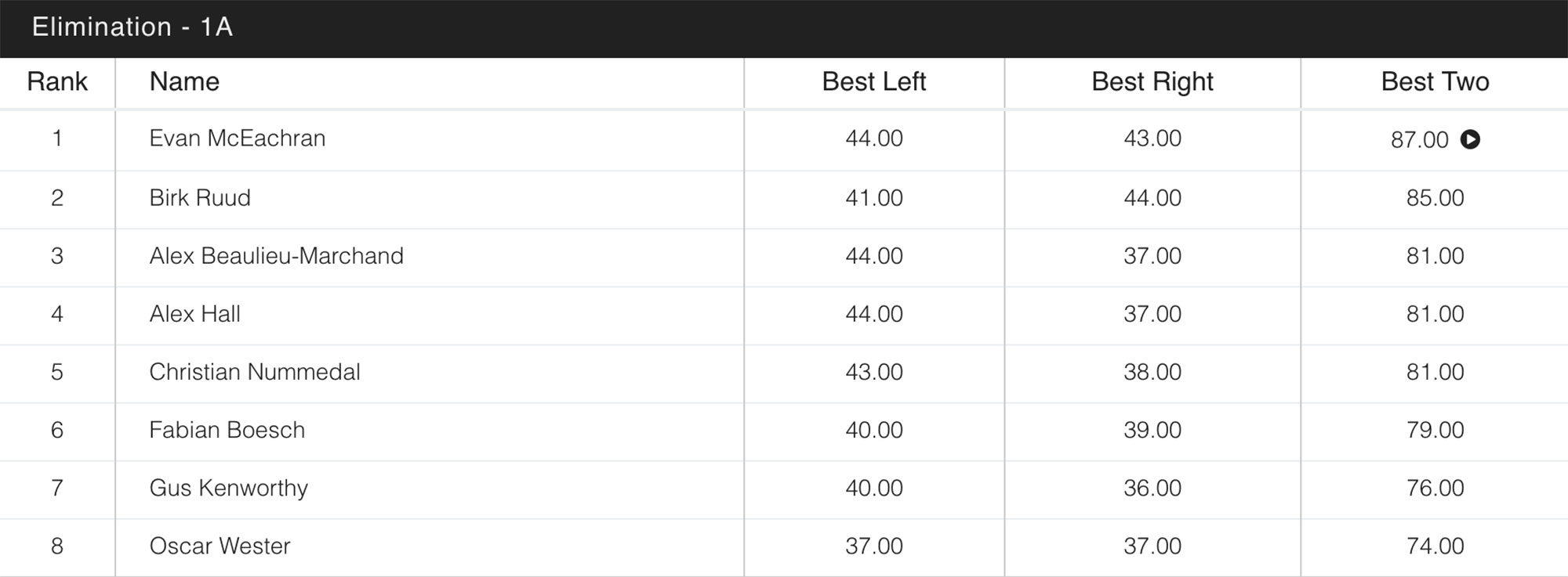 To put it more simply, it was an absolute throwdown on the Big Air jump today. McEachran topped the field ahead of Birk Ruud, who landed matching left and right double cork 1440 tail-to-tail grabs, and Alex Beaulieau-Marchand with a switch left triple 1440 bow-and-arrow grab and a switch right double 1440 tail.