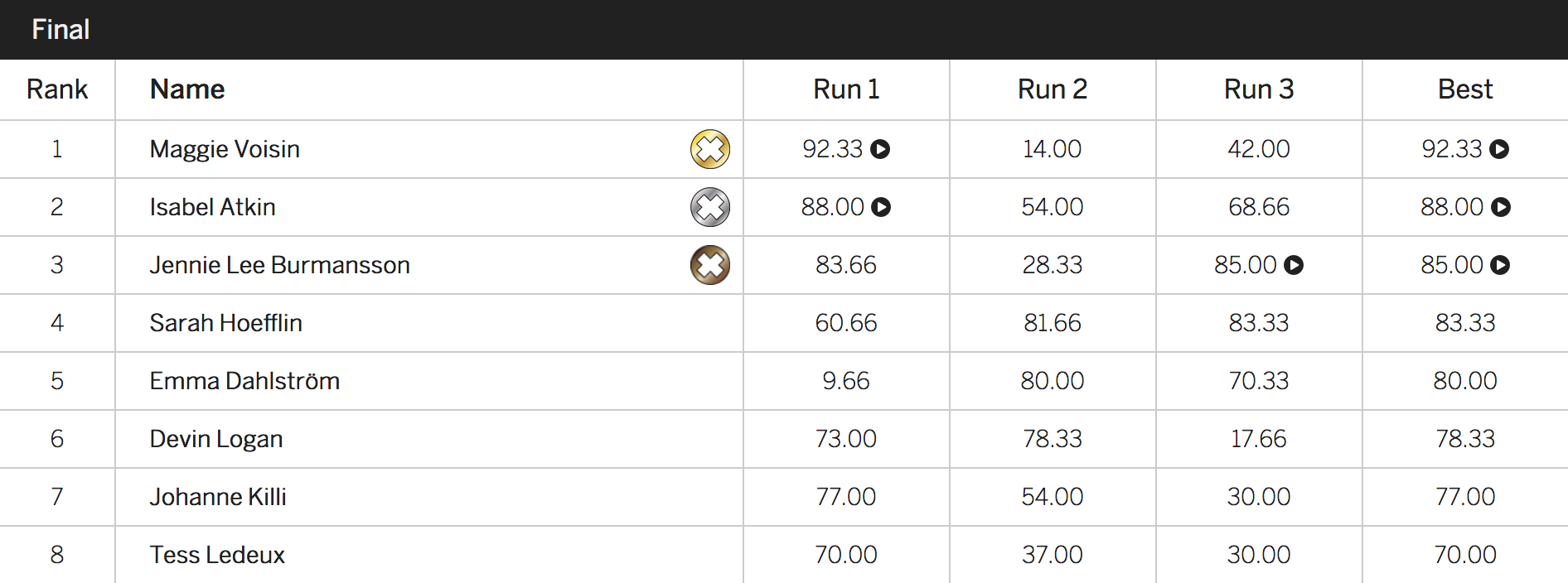 Voisin posted the winning score, a 92.33, on her first of three runs, with a solid rail section and three different 900s in the jumps: a right 900 tail, switch left 900 mute, and a left rodeo 900 japan on the final jump.