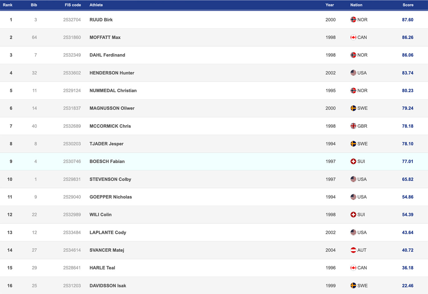 The men’s finals featured sixteen heavy hitters, and the contest was much more narrowly decided than on the women’s side. Less than two points separated the top three finishers. Ultimately it was Norway’s Birk Ruud who won the day.