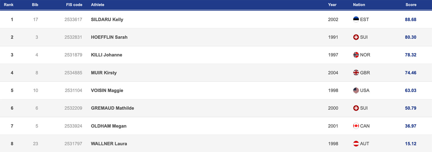 Austrian hometown favorite Laura Wallner crashed in both her runs, while American and Canadian leading ladies Maggie Voisin and Megan Oldham weren’t able to deliver a clean run. In the scare of the day, Switzerland’s Mathilde Gremaud went down hard in a crash on her second run and had to be airlifted from the course. Thankfully, early reports indicate that her injuries aren’t serious.