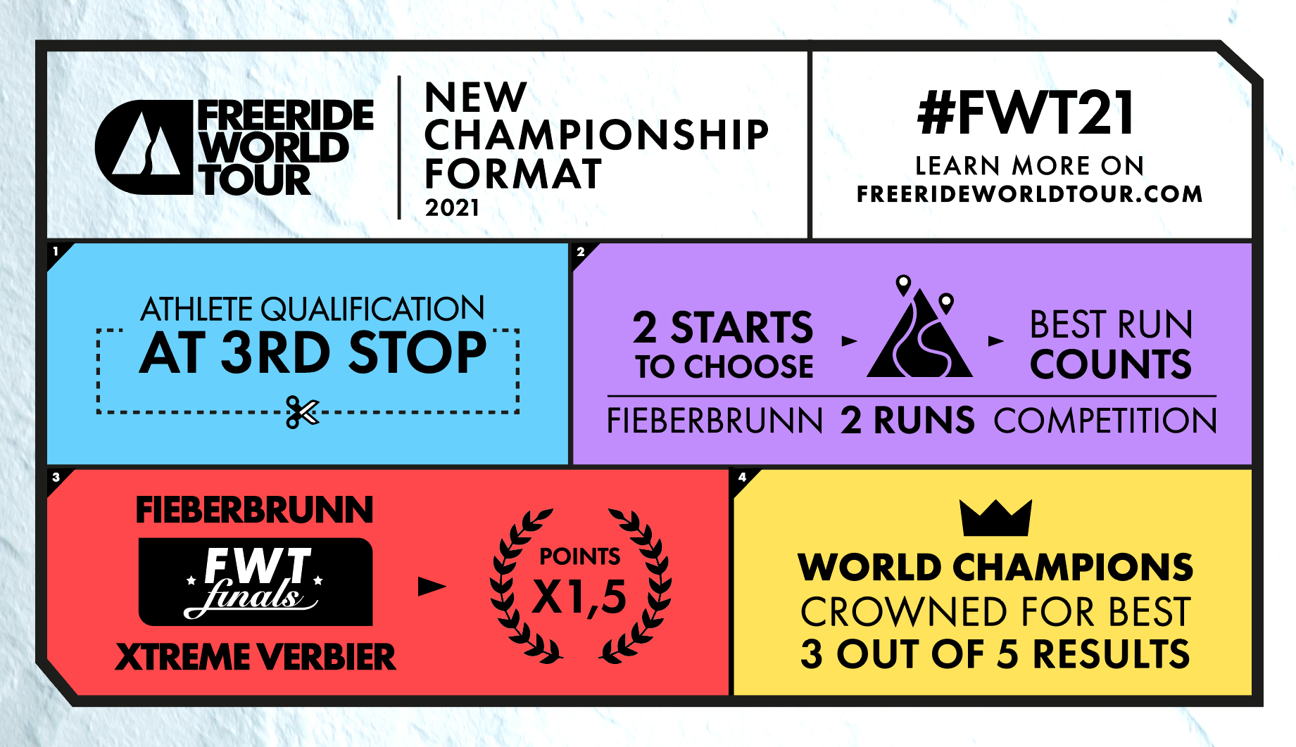 Second, athletes will get not one, but two runs in Fieberbrunn, keeping their single best score from the day. Third, the last two events (Fieberbrunn and Verbier) will be weighted 1.5 times as much as the prior three events. The winner of the first stop in Hakuba, for example, will take home 10,000 points towards the overall victory, but the winner in Fieberbrunn will earn 15,000 points. And last but not least, the overall champion will be determined by their best three out of five results from the season—not by all of them.