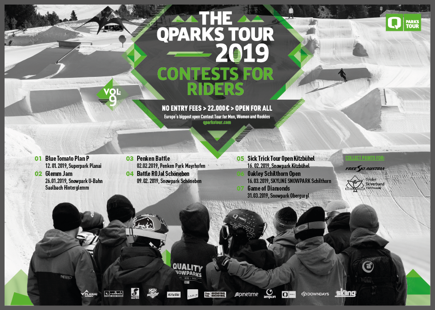 During the winter 2019, the QParks Tour will once again live up to its role as the biggest rookie series for freeskiers and snowboarders and will stop at seven destinations in Austria, Italy and Switzerland. ”Supporting young talents” is one of the main goals of the QParks Tour and so far, it has helped pave the way of many shred talents towards a pro career. The contests will always take place on a perfectly shaped setup in slopestyle format, where it’s all about impressing the judges. And doing that definitely pays off. The competitors from the categories men, women & groms should definitely show their best moves – after all they have the chance to bag considerable prizemoney as well as some nice goodies from Amplifi, Pinetime, QParks and Oakley. Since a day full of contest action burns a bunch of calories, all starving rookies can feast on some delicious snacks and drinks for free while chilling to nice sounds.