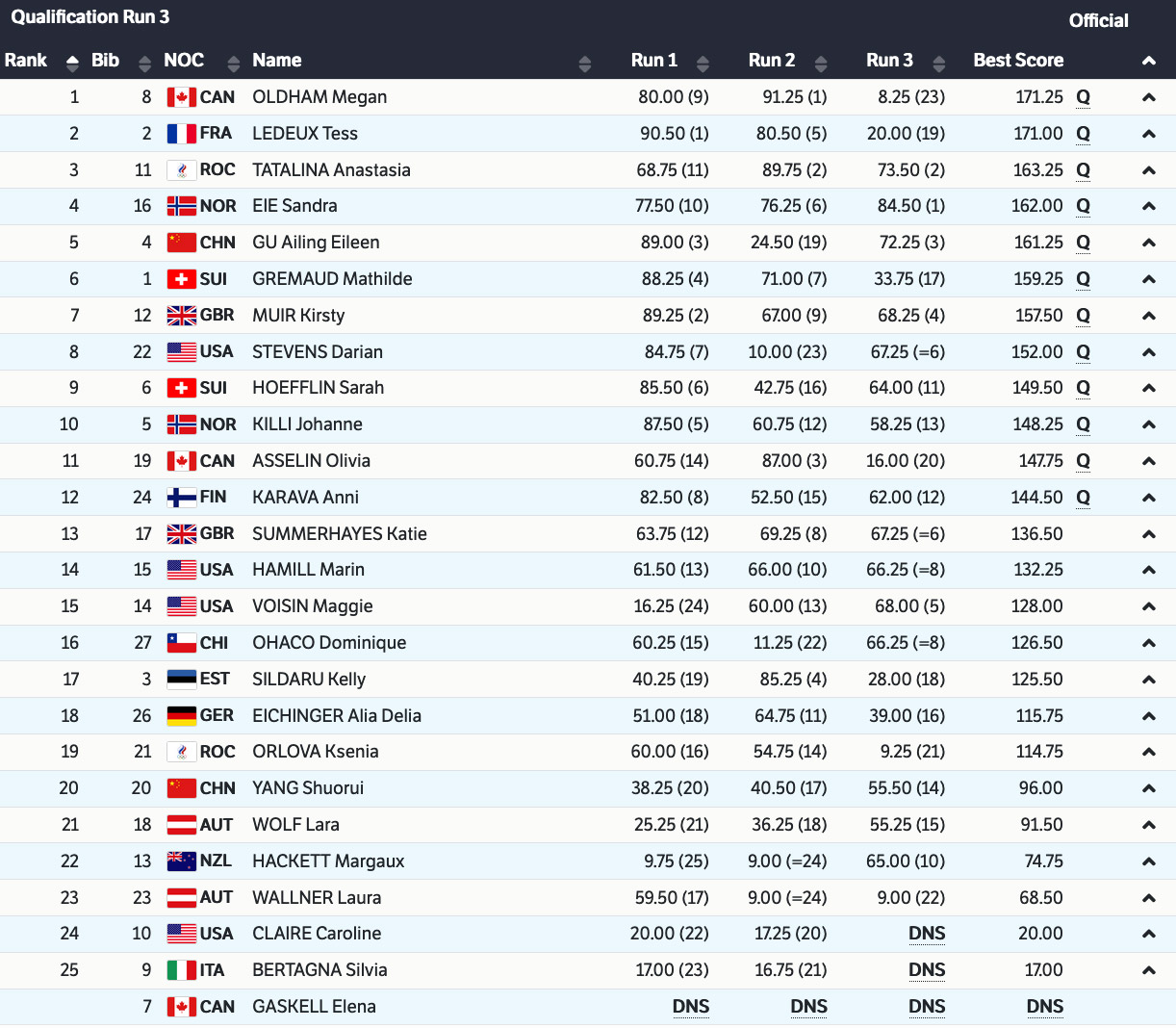 Women's Big Air Qualification Results