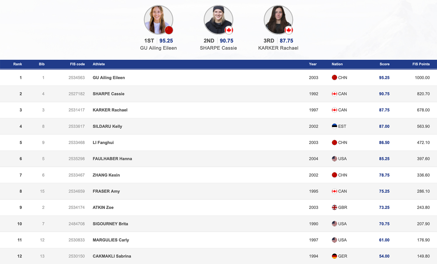 Cassie’s Team Canada teammate Rachael Karker completed the podium in third place on the strength of her first run, with matching both-way 900 japans and flairs.