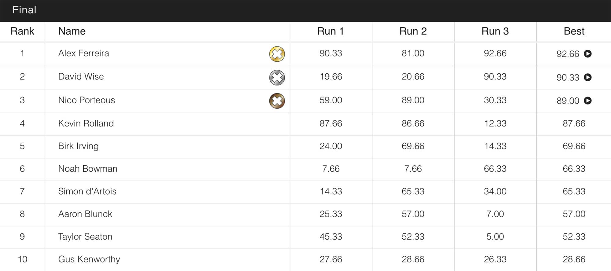 On the second-to-last run of the night, Ferreira delivered his run bigger and better than before: right dub 12 mute, left dub 10 safety, switch right 7 japan, left dub 12 mute and down-the-pipe double flatspin 9 japan, boosting his score to a 92.66 to improve his lead. The last to drop was David Wise, able to perform under pressure, who finally scraped together a full run with a switch right 7 japan, left dub 12 mute, right 10 tail, switch left dub 10 japan and a right dub 12 mute — not entirely clean, but earning the judges’ approval for a 90.33 and second place. The final podium: Ferreira, Wise and Nico Porteous, with Kevin Rolland unhappy in fourth.