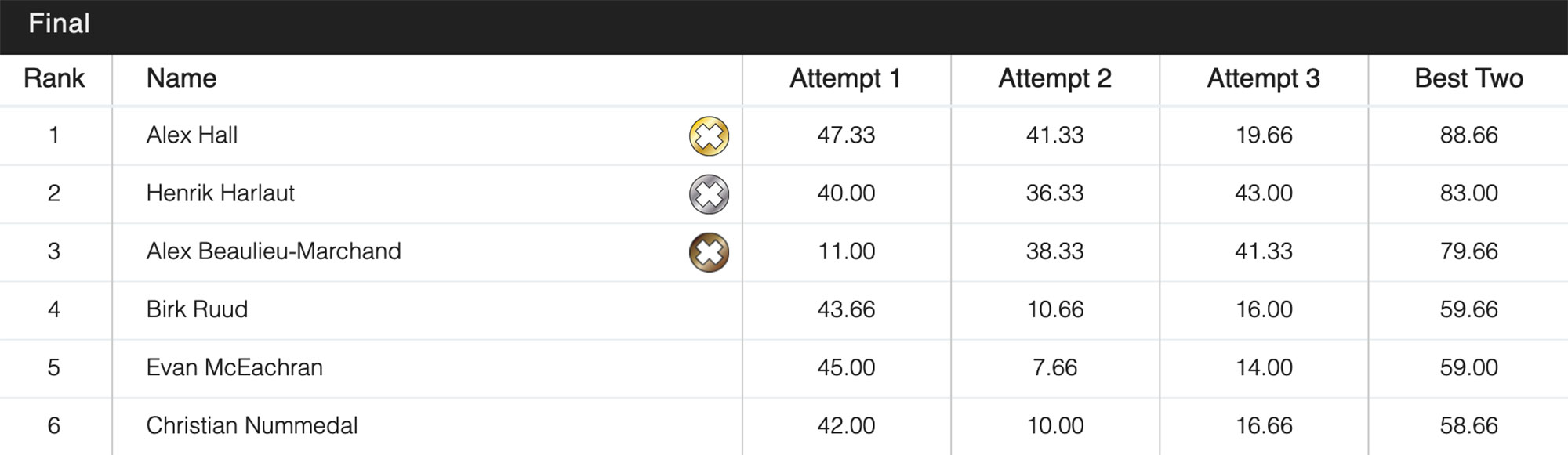 It was an unfortunate showing for home-crowd favorites Christian Nummedal and Birk Ruud, who failed to break into the top three. Nummedal somehow recovered from a massive crash on a triple cork 16 attempt to take his final jump, while Ruud’s recent run on X Games gold medals is halted at two, at least for the time being. Canada’s Evan McEachran also struggled in the finals with a switch double 14, and will be looking forward to his next opportunity.