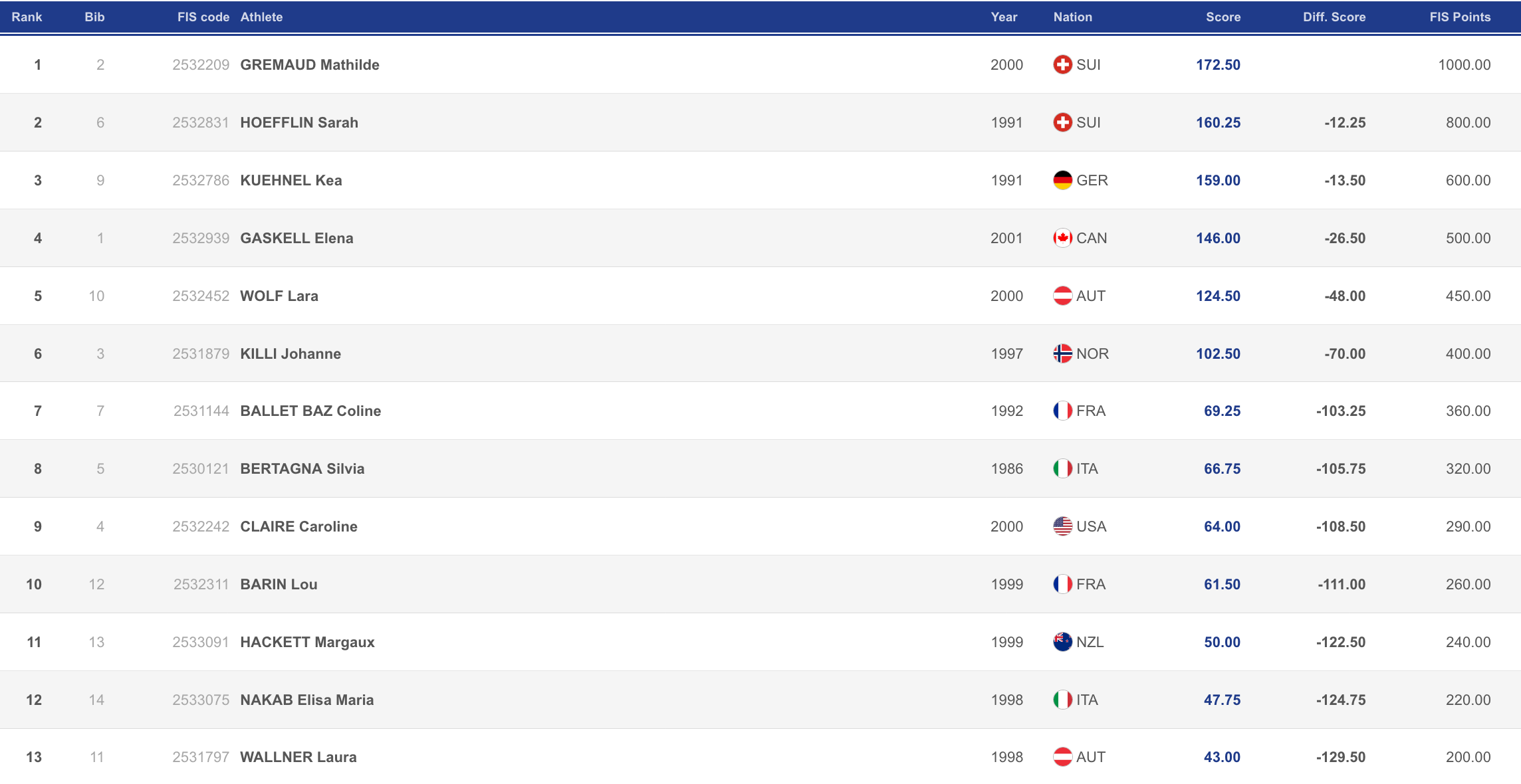 On the women’s side, Gremaud prevailed with the help of a switch bio 900 and switch rodeo 720 mute, followed by Swiss teammate Sarah Hoefflin (switch right and switch left 720s) in second, and Germany’s Kea Kühnel (cork 7 safety) in third.