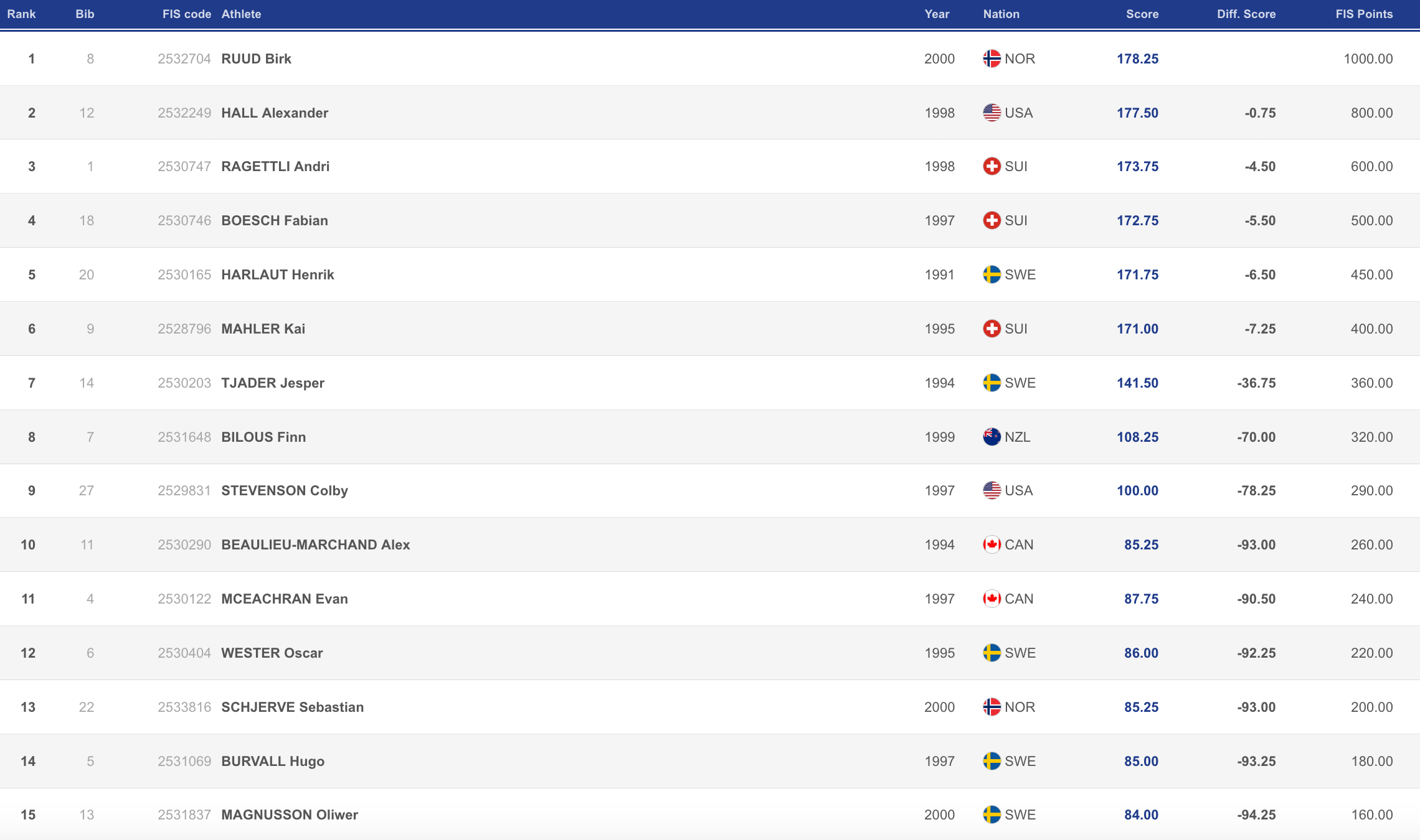 In the finals, highlights included a switch triple 12 and double bio 12 from Henrik Harlaut, a switch double 14 seatbelt japan + tail and dub 16 stale from Alex Hall, and a classy double cork 7 safety to cossack from Alex Bealeaui-Marchand. Ruud bagged the top spot with a switch double cork 16 tail and switch dub 14 tail to tail, followed by A-Hall in second and Andri Ragettli (switch double misty 16 safety, triple cork 16 safety) in third.
