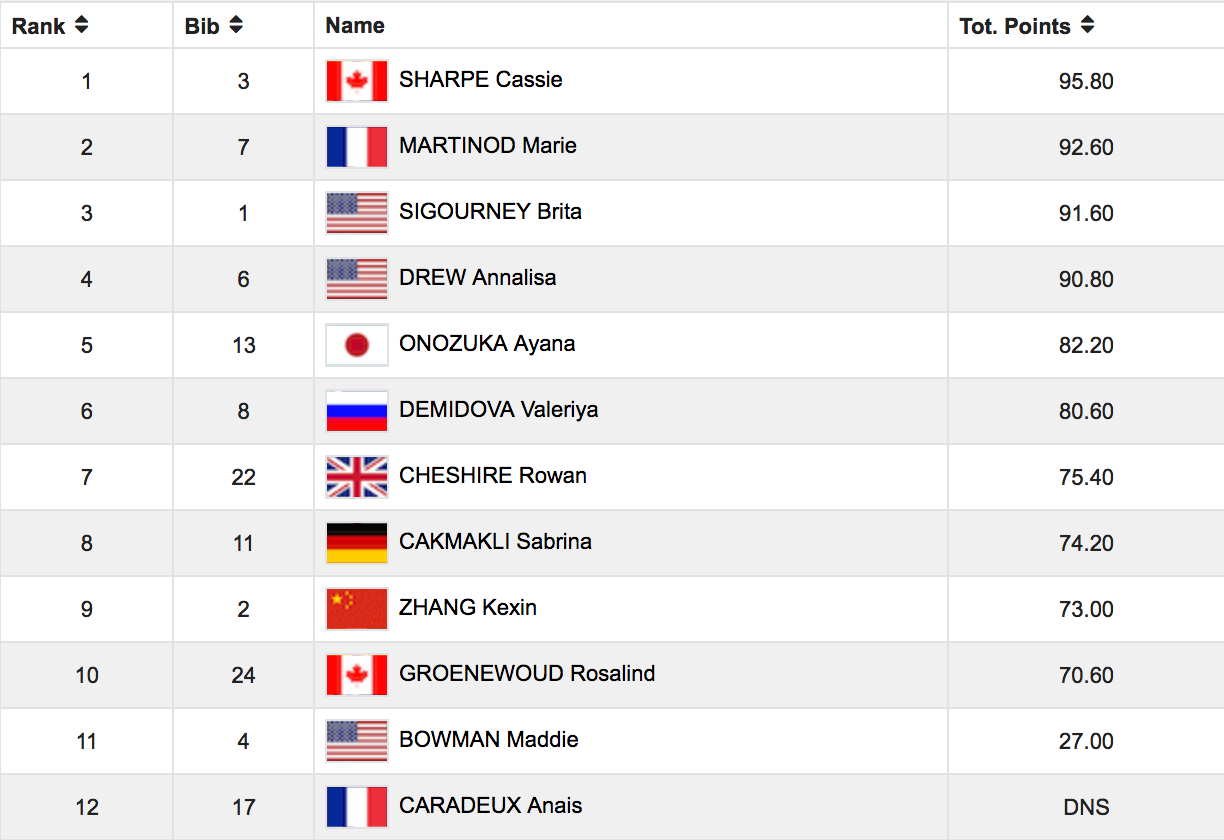 It was a bitter day for defending gold medalist Maddie Bowman, who in all three of her runs couldn’t put down a rightside 900 on her last hit to seal the deal. It’s also a disappointing day for Anais Caradeux, who didn’t start in the finals, as well as for Austria’s Lisi Gram—who sitting in 13th place, could have taken Caradeux’s starting spot.