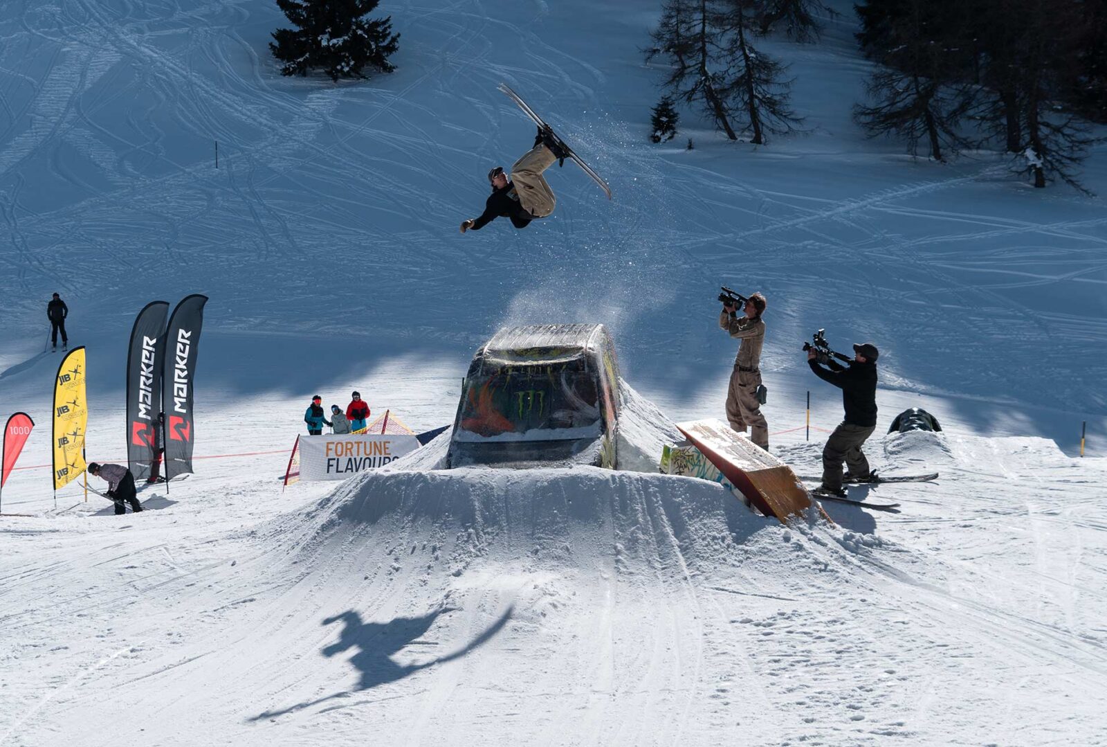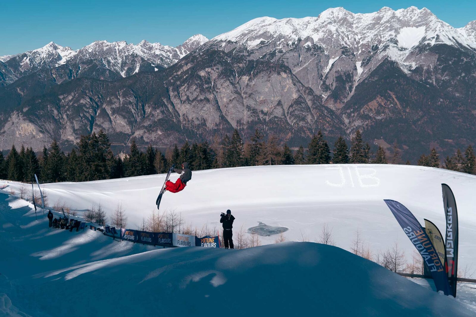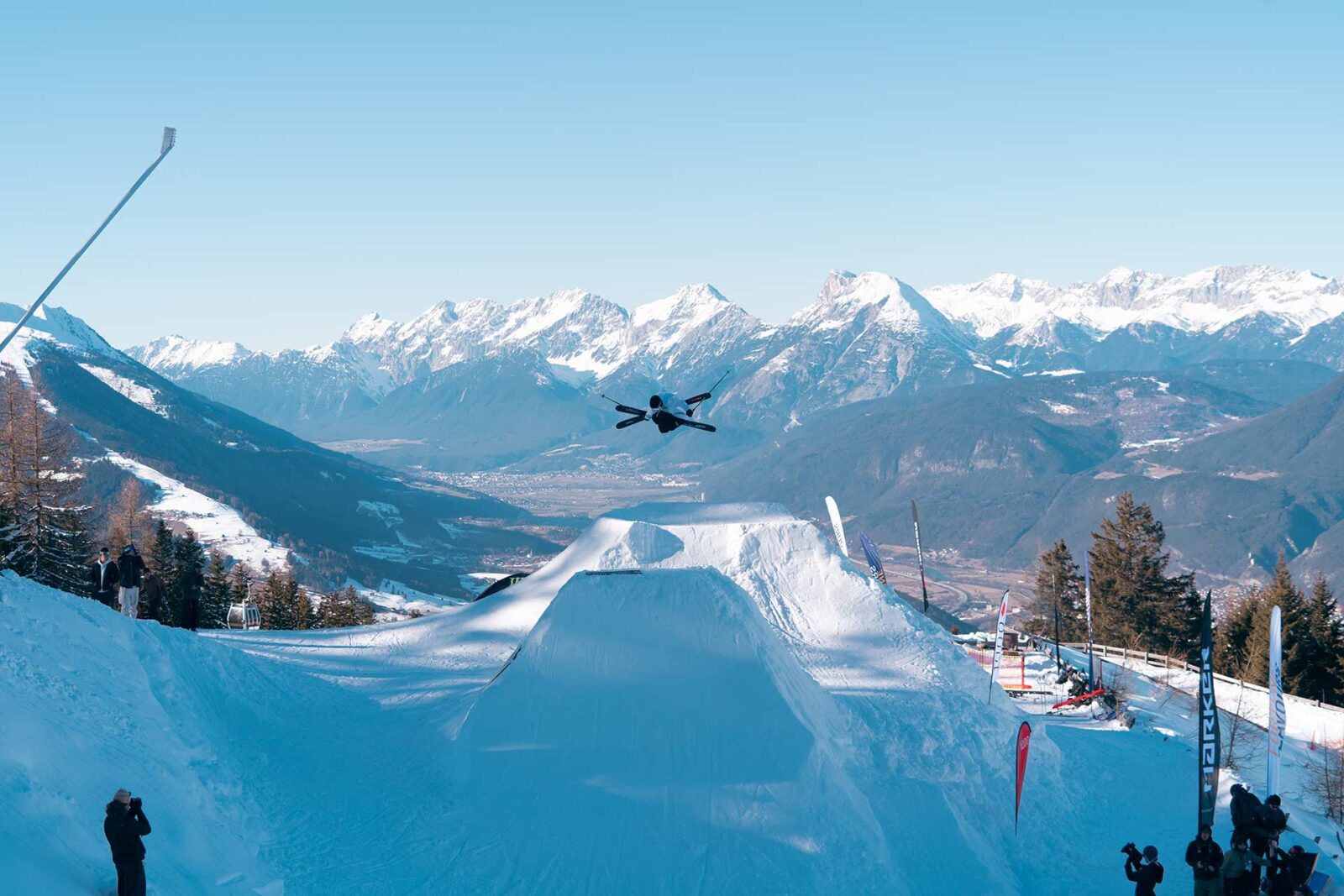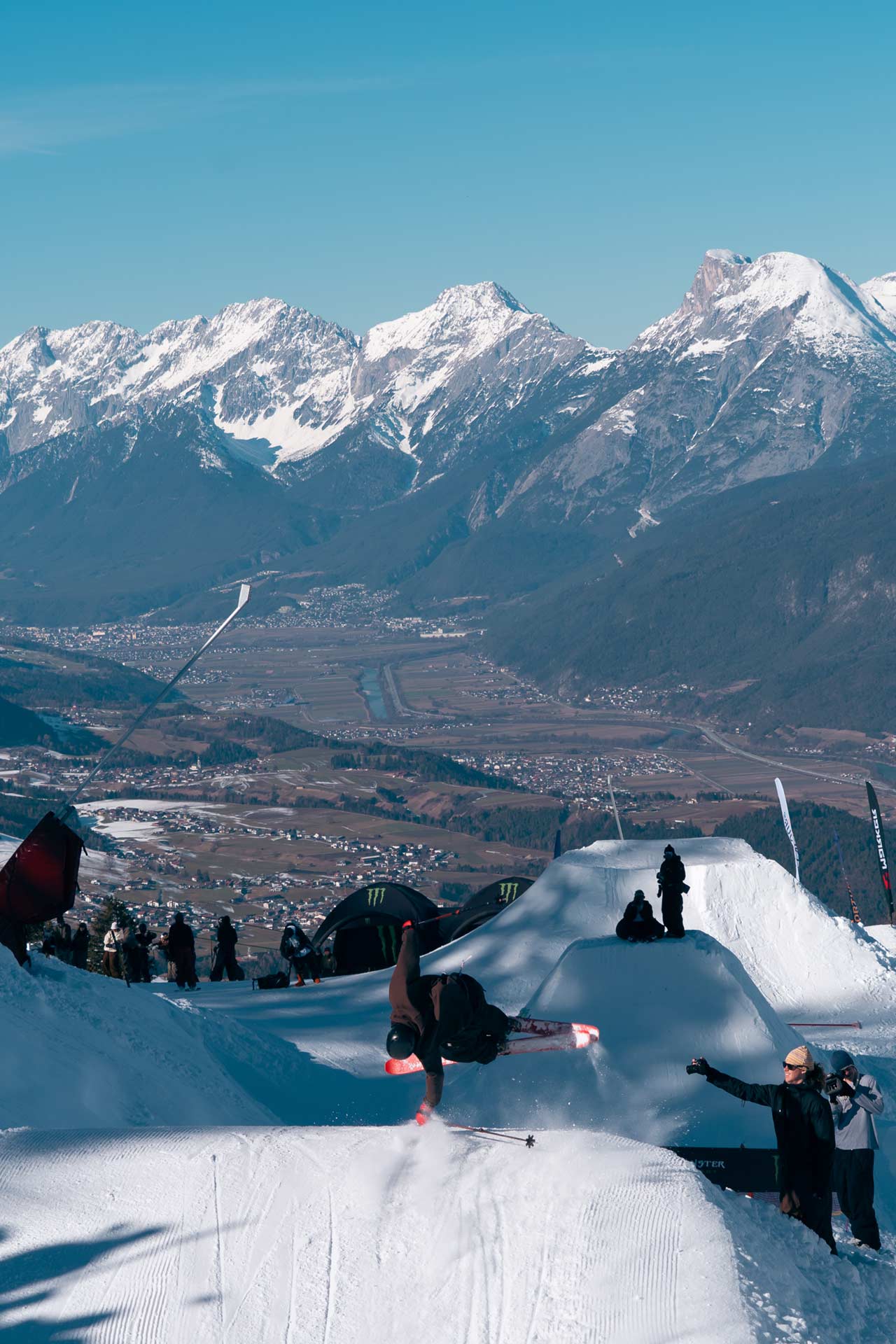 At Muttereralm the setup changed daily, pushing riders beyond traditional park skiing and into a more progressive jam format. The AM session kicked off with tech-heavy rail lines, from down-flat-downs to urban setups, before shifting to a knuckle feature on day three—an all-you-can-eat buffet of butters, presses, and lofty airs.
