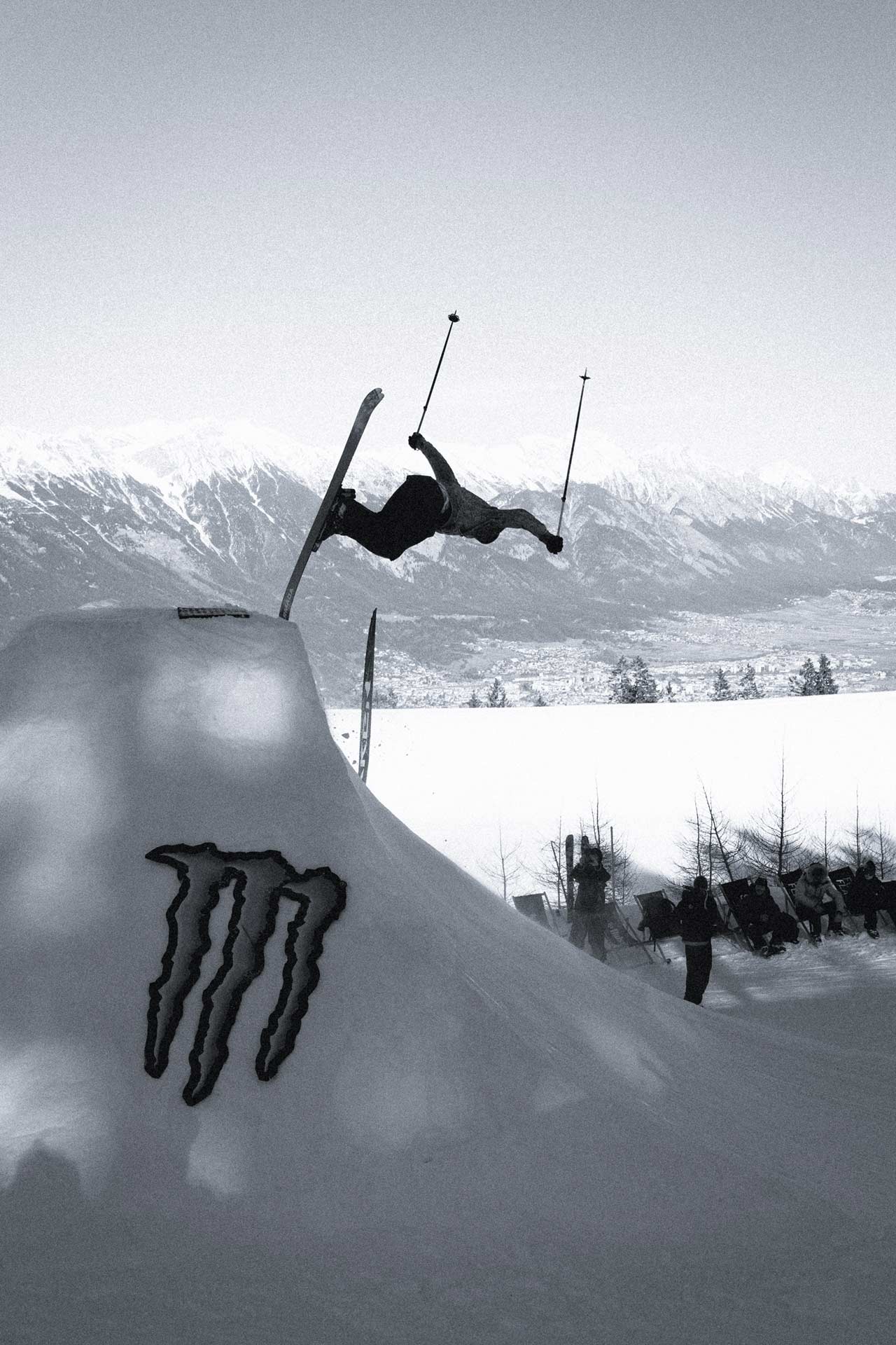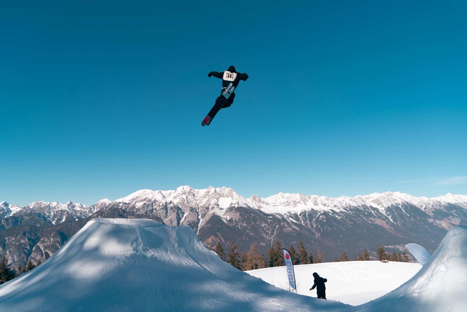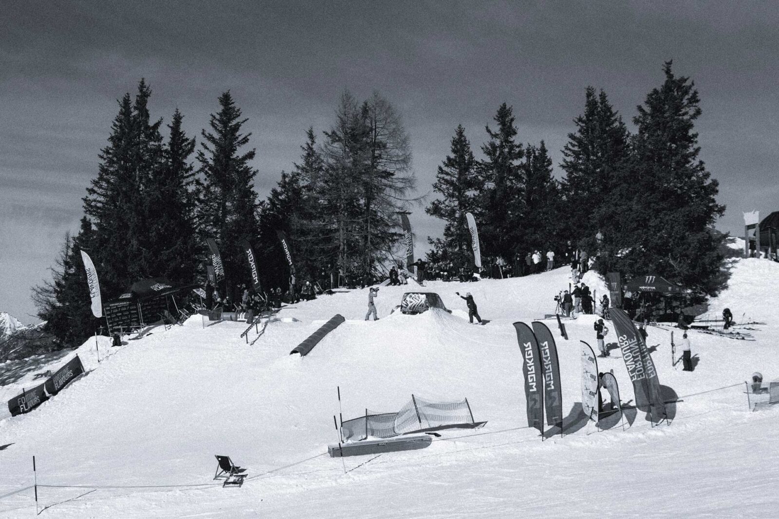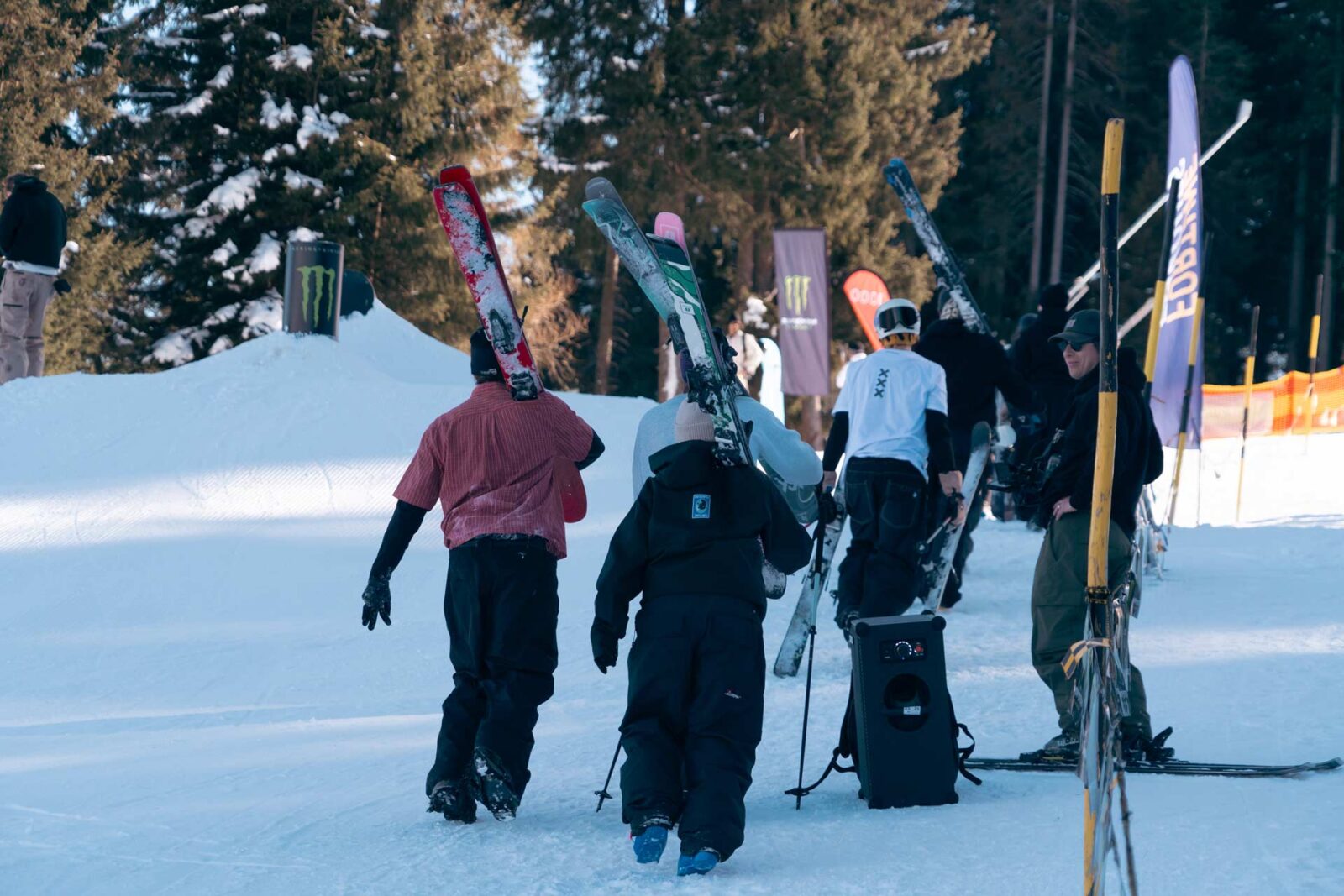 At Muttereralm the setup changed daily, pushing riders beyond traditional park skiing and into a more progressive jam format. The AM session kicked off with tech-heavy rail lines, from down-flat-downs to urban setups, before shifting to a knuckle feature on day three—an all-you-can-eat buffet of butters, presses, and lofty airs.