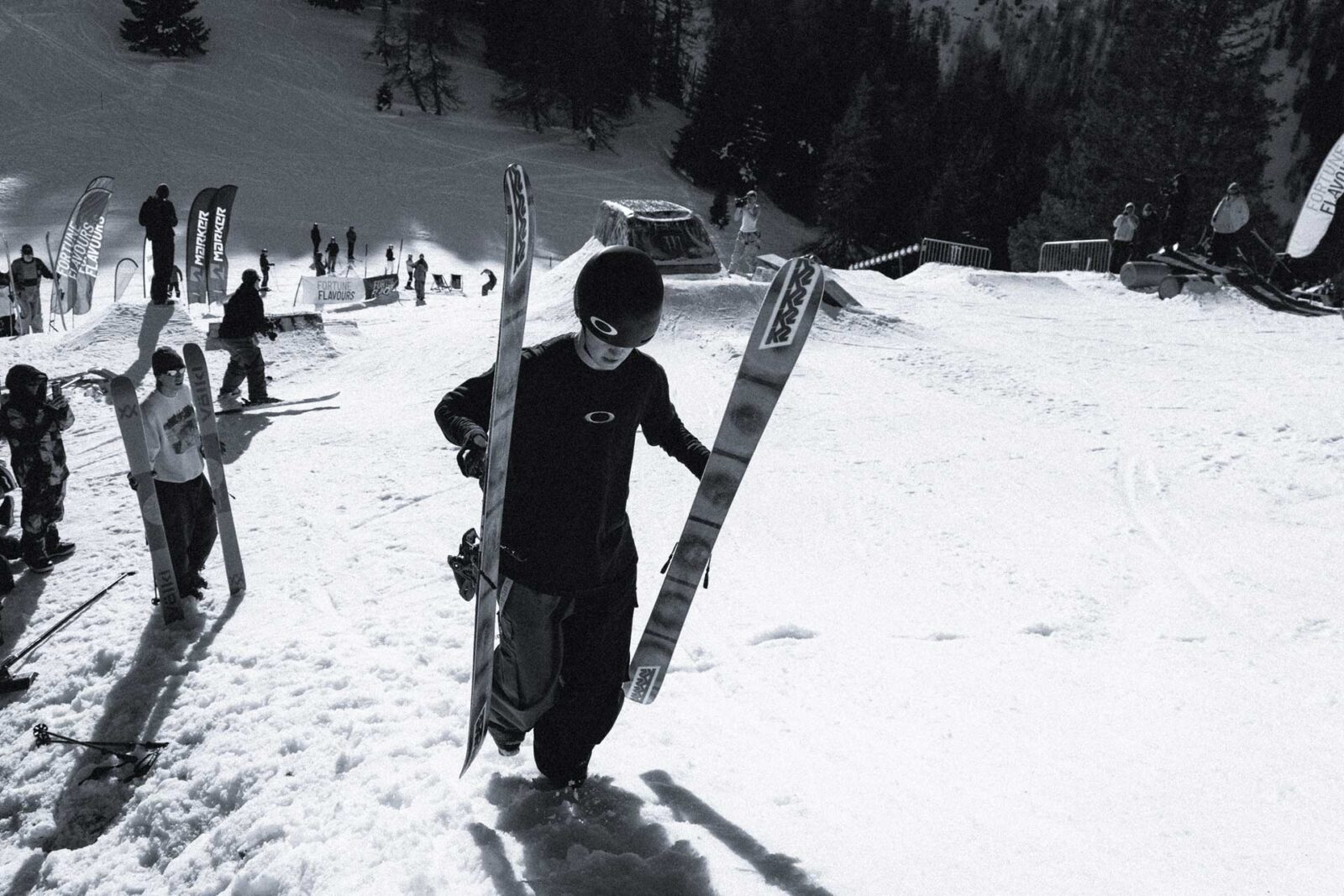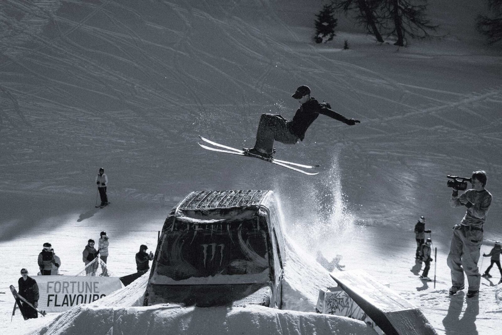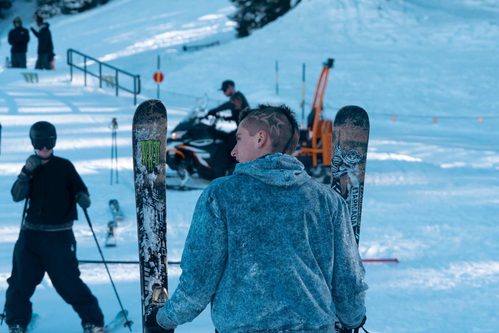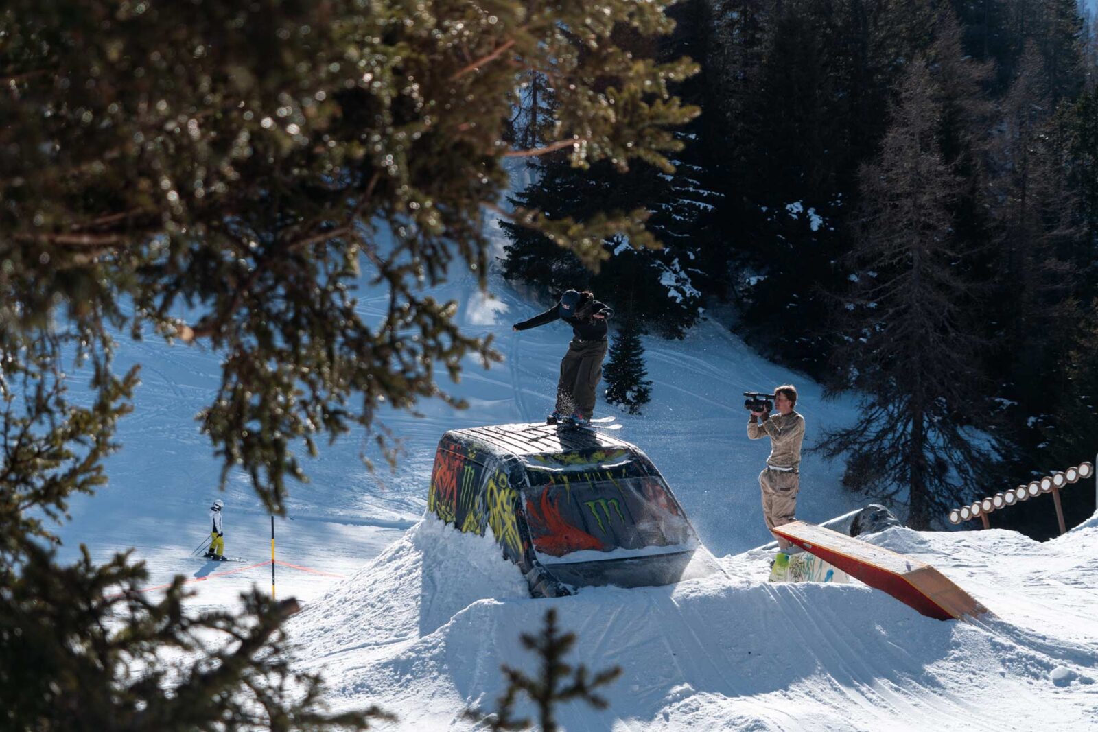 At Muttereralm the setup changed daily, pushing riders beyond traditional park skiing and into a more progressive jam format. The AM session kicked off with tech-heavy rail lines, from down-flat-downs to urban setups, before shifting to a knuckle feature on day three—an all-you-can-eat buffet of butters, presses, and lofty airs.