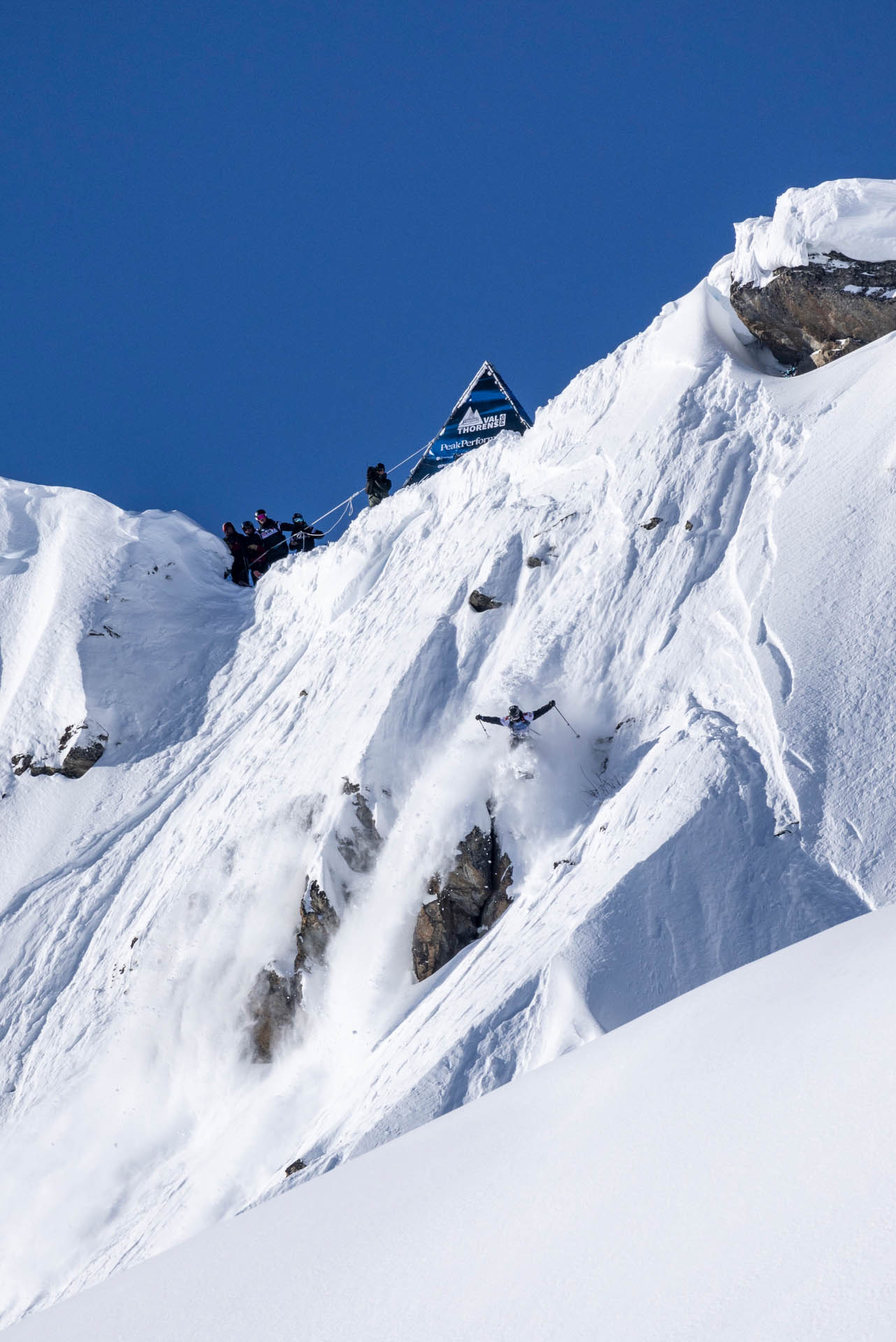 The third place in Ski Men’s went to Marcus Goguen. The Canadian was the only rider among the top six to take the skier’s right start, which was the highest and also offered the steepest and most technical top part; but on this side of the face more than half of the run was pretty flat and a traverse to the steep section skier’s left wasn’t an option due to the deep snow. However, Marcus Goguen delivered on that short stretch what was probably the move of the day. He entered the course with a massive backflip over the cornice and underlying cliff for a drop easily exceeding ten vertical meters, landing in a steep section that was above just another cliff. Two fast controlled turns, a very surefooted straight air and he was out of the top section. In search for more features, Marcus traversed out skier’s right with high speed, two times almost getting hung-up in the snow, for another good drop including a 360, but all in all it just wasn’t enough skiing for an even better result. At least, last year’s overall runner-up in the FWT had a good comeback after a rather disappointing result in Spain. In contrast, the winner of Baqueira Beret, Ross Tester, had a fall after a great top section while landing a jump in the transition to the flatter terrain—just as most other riders who opted for the skier’s right start gate.