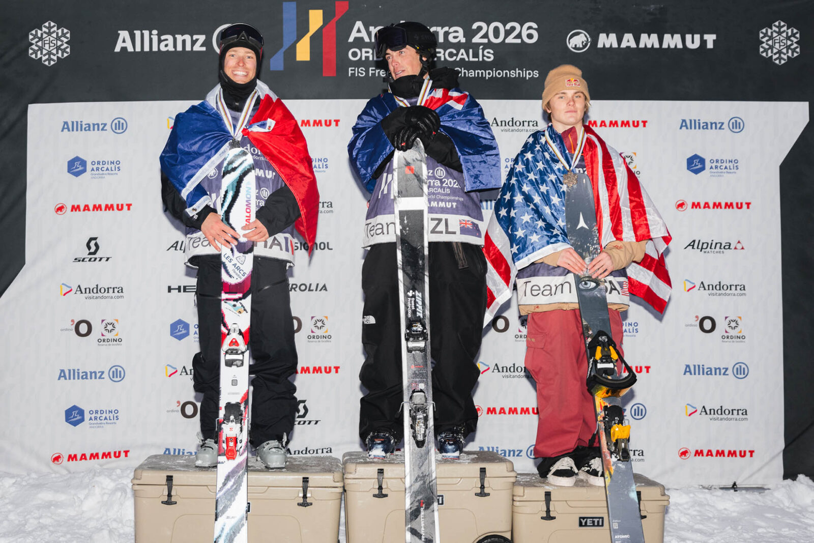 Ordino-Arcalis presented a legit stage for a historical freeride competition. The first ever official—read: sanctioned by FIS—World Championships took place in Andorra in fine fresh powder on a competition venue that lived up to the occasion. Ben Richards extended his streak of victories this season, the kiwi secured the first ever awarded Freeride World Champion title with an immaculate run through challenging terrain including huge airs, incredible flow and two stylish 360s. France’s Ugo Troubat became a clear second ahead of Kai Jones. The American youngster’s spot on the podium was much more contested in a competition that saw great performances but very few clean runs and some unlucky losses of skis due to rocks hidden under the new snow.