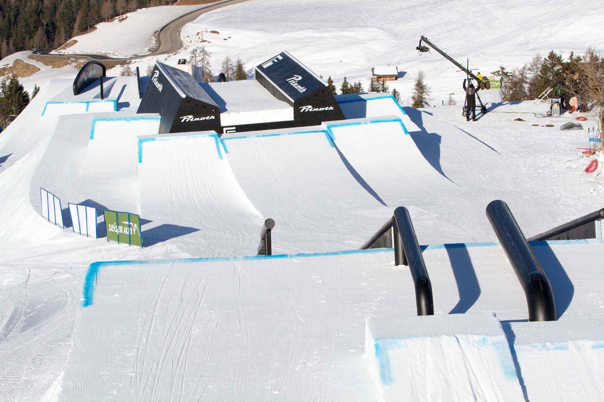 Among the world’s snowparks, few come as sculpted as the ones in Italy created by the F-Tech snowpark team. The Seiser Alm Legends course might be the pinnacle of them all. From squeaky-clean rail setups including the unmistakable Prinoth feature—a big, boxy set of angles with a complicated transfer option to a down rail—to a three-jump line that is nothing short of pristine, it’s clear that the Seiser Alm park crew and the community around them put a lot of energy into this event. The Legends team put more effort into media production this year, resulting in some great followcam and drone footage from the sunny training days leading up to the event.
