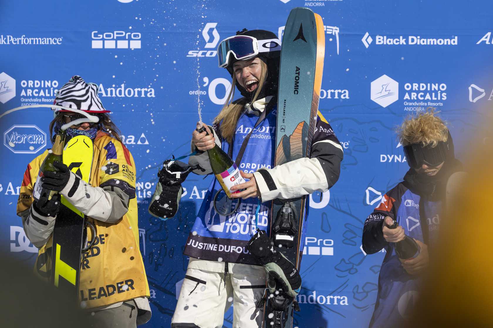 Molly Armanino caused a collective breath-hold in Ordino-Arcalís when she nearly pin-balled herself off the rocky cliffs after straightlining a narrow couloir. The American rookie held on as she shed her speed, and popped off more cliffs down below, for a speedy, complete run worthy that of second place. To close out the field, Olympian Justine Dufour-Lapointe cruised through several straight airs and a cross-hill windlip transfer. With the combination of features and fluid skiing, the Canadian earned the top spot for the day.