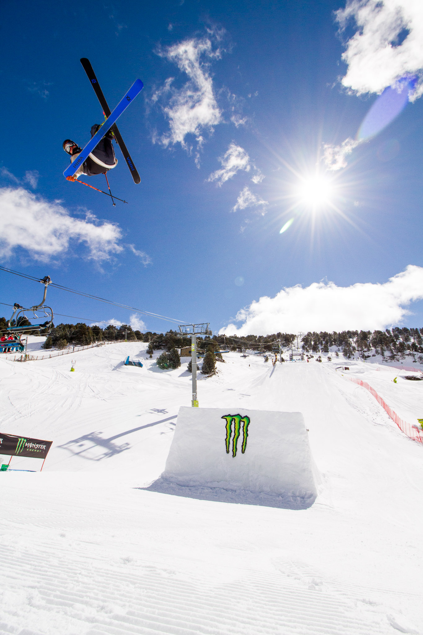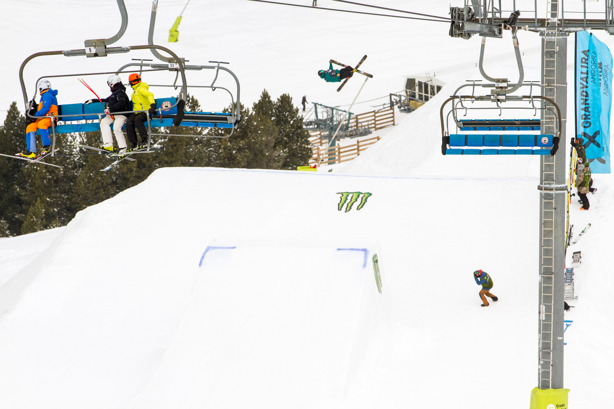 Thursday was training day on the slopestyle course in the El Tarter snowpark at Grandvalira. The nearby snowpark at Peretol, aka Henrik Harlaut Park, home to the SLVSH Cup which is currently dropping games, undoubtedly gets more play in the international media. But El Tarter is actually the main snowpark of Grandvalira—the largest ski resort in the Pyrenees with over 200km of pistes. Grandvalira sprawls across several mountaintops, connecting the resort towns of Soldeu, El Tarter, Pas de la Casa, Grau Roig, Canillo and Encamp. Grandvalira’s trademark is its “X” logo — inspired by two crossing pistes forming this unmissable symbol on the hillside above the town of El Tarter.