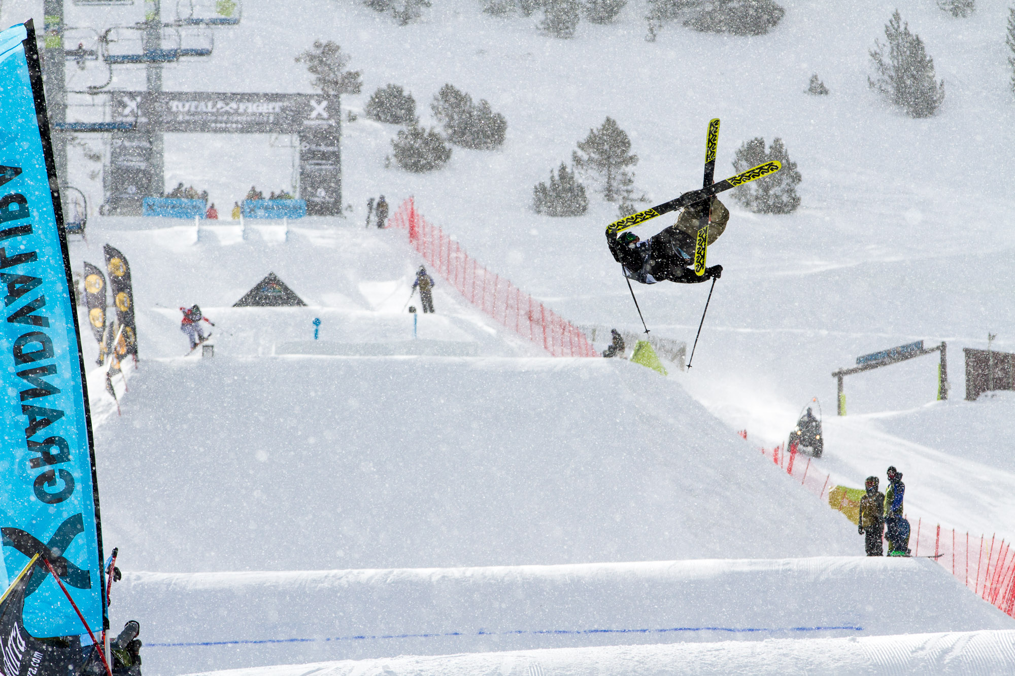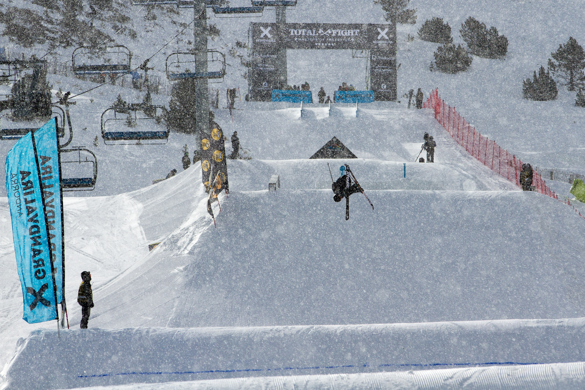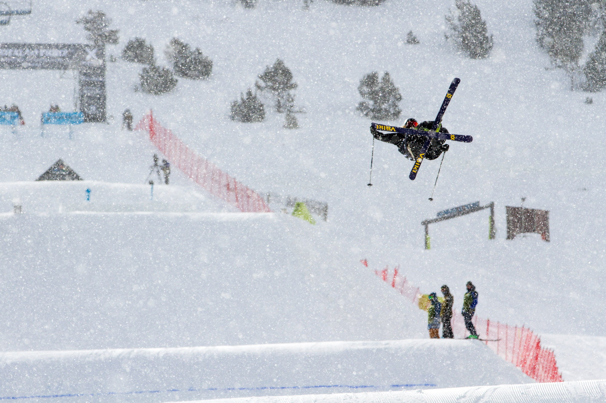 The weather closed back in for Friday’s qualification round, presenting an additional challenge for the competitors as they strived to land a good run and advance to the semis. A clear line began to emerge in the field between the skiers willing and able to chuck double corks in questionable conditions, and those who stuck to their 720s and 900s. At the end of qualis, Fabian Bösch maintained the top position after putting down three different double cork 12s in his run, while Colby Stevenson followed closely in second with a high-class performance in the rail section, including a rightside 270 on backlide 270 out that he’s apparently got on lock, and a blind swap, front 630 out of the up-to-flat transfer that most other competitors awarded. A grab bag of other competitors filled out the top 12 spots, with several riders in the “locals” category, like Andorran native Carlitos Aguareles Loan, Spanish riders Javier Lliso and Thibault Magnin, and France’s Vince Maharavo all advancing. The big surprise was defending champ McRae Williams narrowly missing the cut in unlucky 13th place—but he actually seemed quite content with the result, not being very hyped to ski in the less-than-optimal weather forecasted for the finals.
