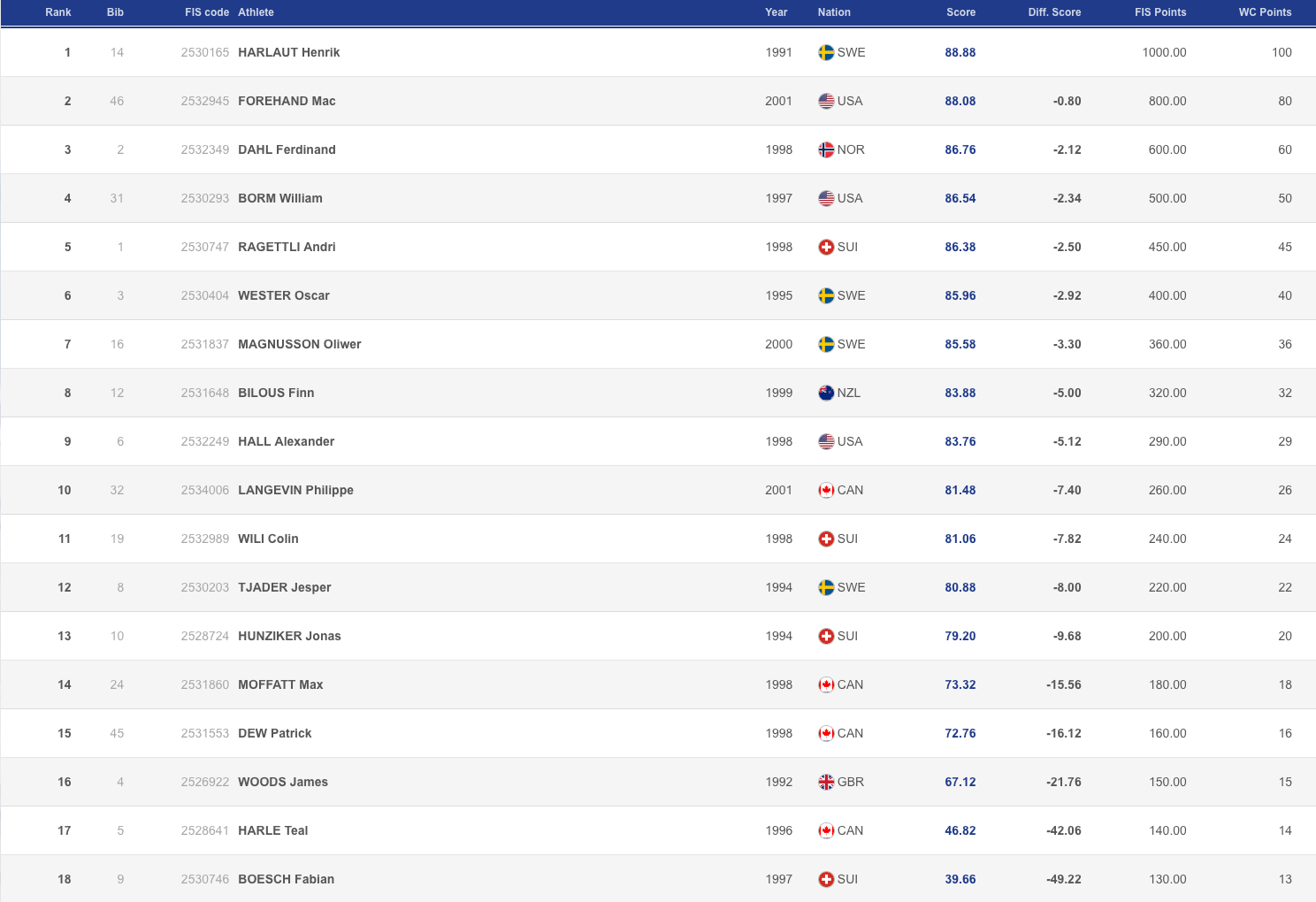 “I’m a little speechless, but also I’m so so happy,” said Harlaut, “I had this run in my mind the whole week and to put it down in my first run it was amazing. I struggled during the practice, but it worked out when it counted. That’s probably one of my best slopestyle runs that I’ve ever done and also my first slopestyle World Cup victory so I’m stoked.”