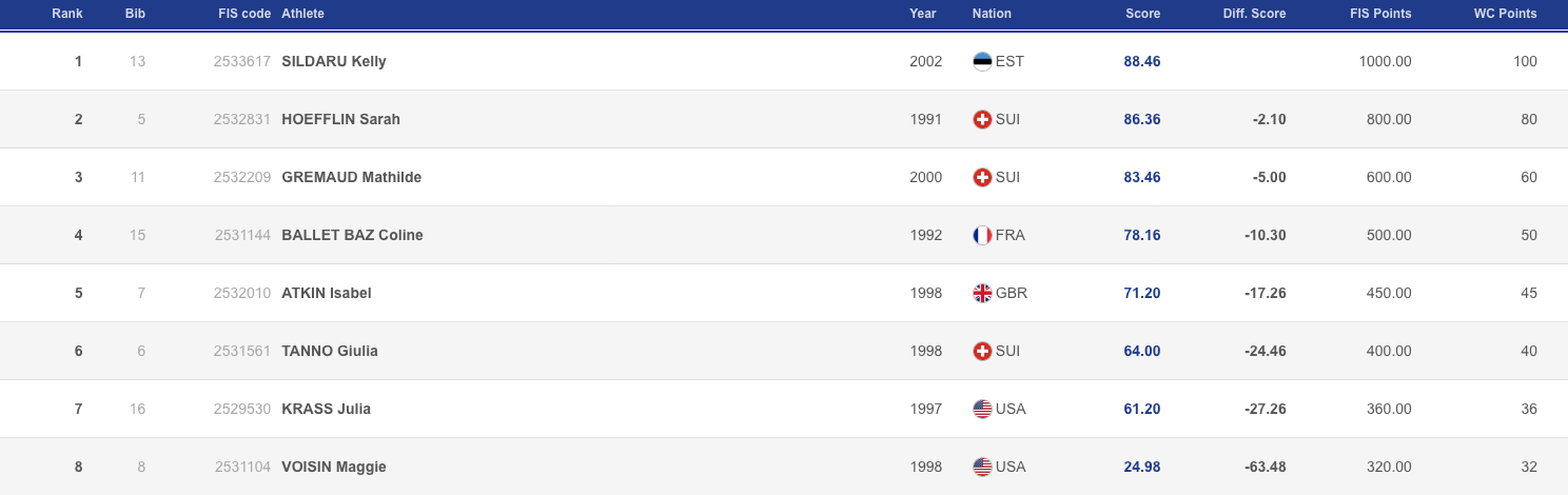 “I’m super happy,” Sildaru told FIS Freestyle. “My grabs could have been a little better, but still I’m pretty stoked about my run, especially about the rails.”