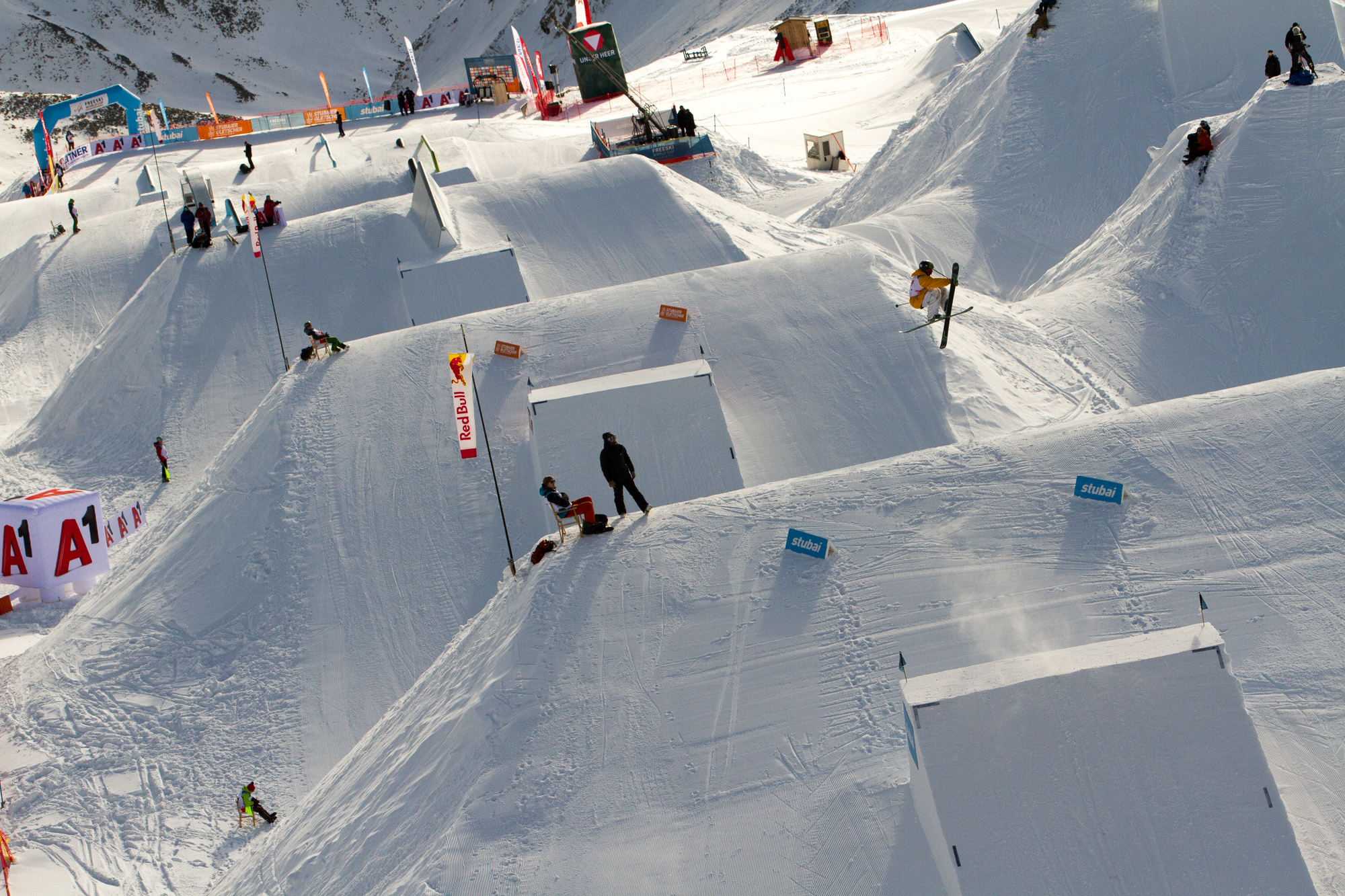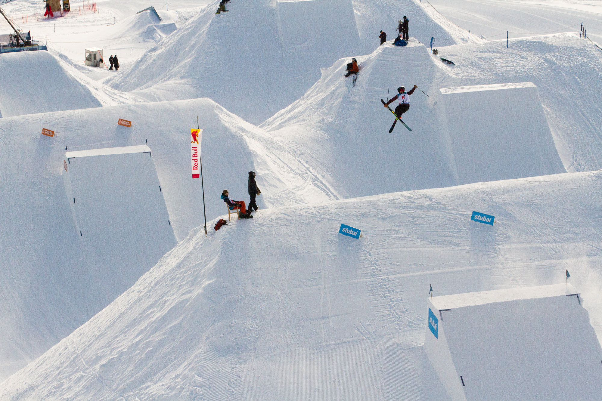 A total of over 70 men and 30 women from over 20 nations gathered at the slopestyle course in the Stubai Zoo terrain park, where activities at the pay-to-play Prime Park Sessions were suspended for the week to make space for the Freeski World Cup. (Side note: If you ever want to hear something more amusing than people complaining about private pay-to-play parks like the Prime Park Sessions, it’s the people who pay for Prime Park Sessions complaining about the World Cup taking over their playground.)