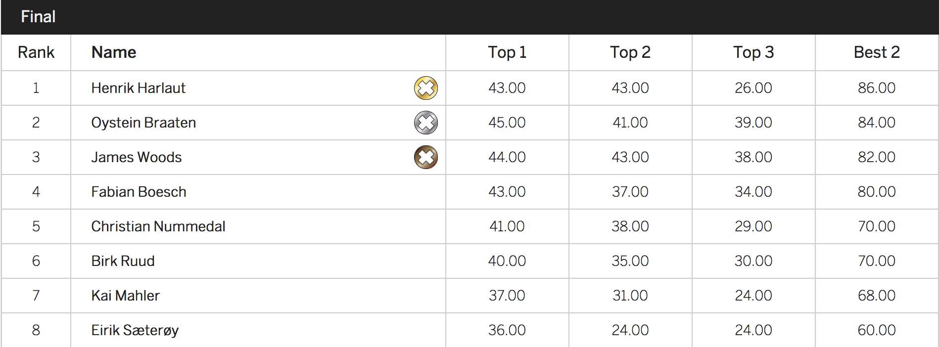 Øystein Bråten nabbed second place with a switch double cork 1440 tail to tail grab to the left, scored at 41, and a switch double cork 1440 safety to japan to the right, scoring a 39. Last year’s winner James Woods rolled into third place with a switch triple cork 1440 octograb to the right (scoring a 44) and a forward triple cork 1440 safety to the left (scoring a 38).