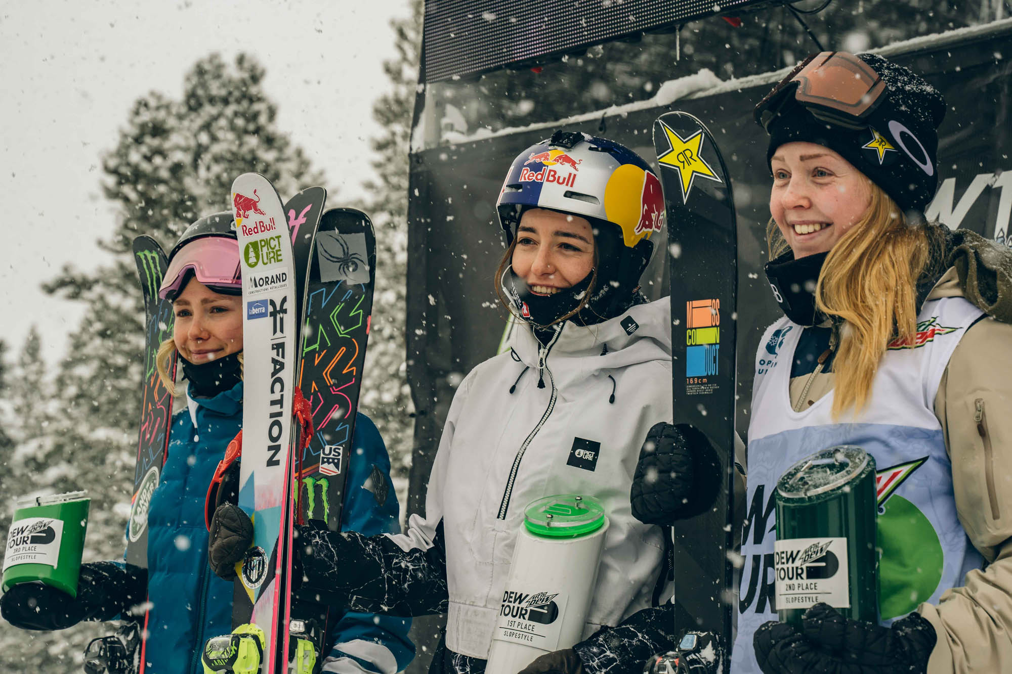 With no one able to change the podium on the third run, Mathilde Gremaud became the new Dew Tour slope champion. This is Mathilde’s second medal from this weekend, including a second-place finish in the Streetstyle event. “Yeah, it’s been big rail week for me.” laughed Mathilde, “It was the craziest week with the weather, pretty frustrating to not be able to ski the entire course, but happy to still have a contest. It would have been a bad idea for us to hit the jumps today, so I’m OK that we didn’t have them.” This thought was echoed by third place finisher Maggie Voisin, who said, “I haven’t skied in a rail jam for a long time, but I’m stoked we were able to still have a contest.”