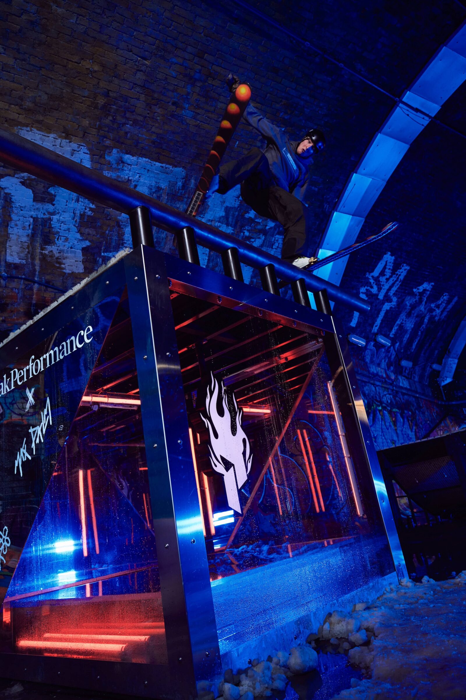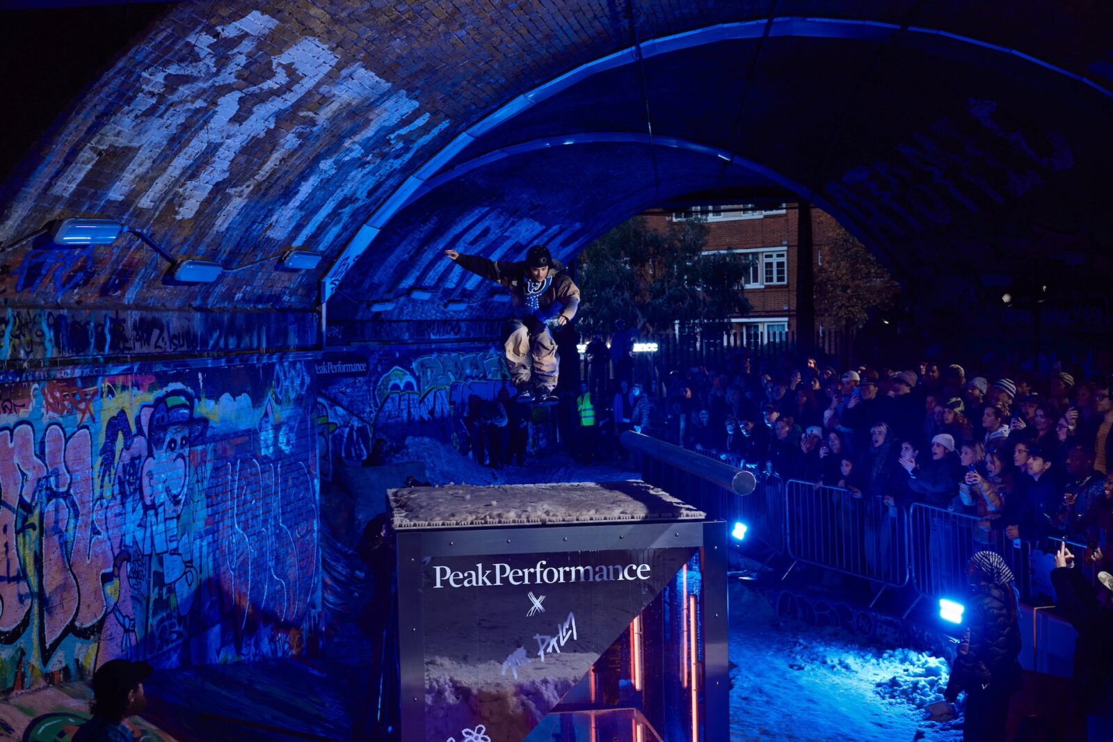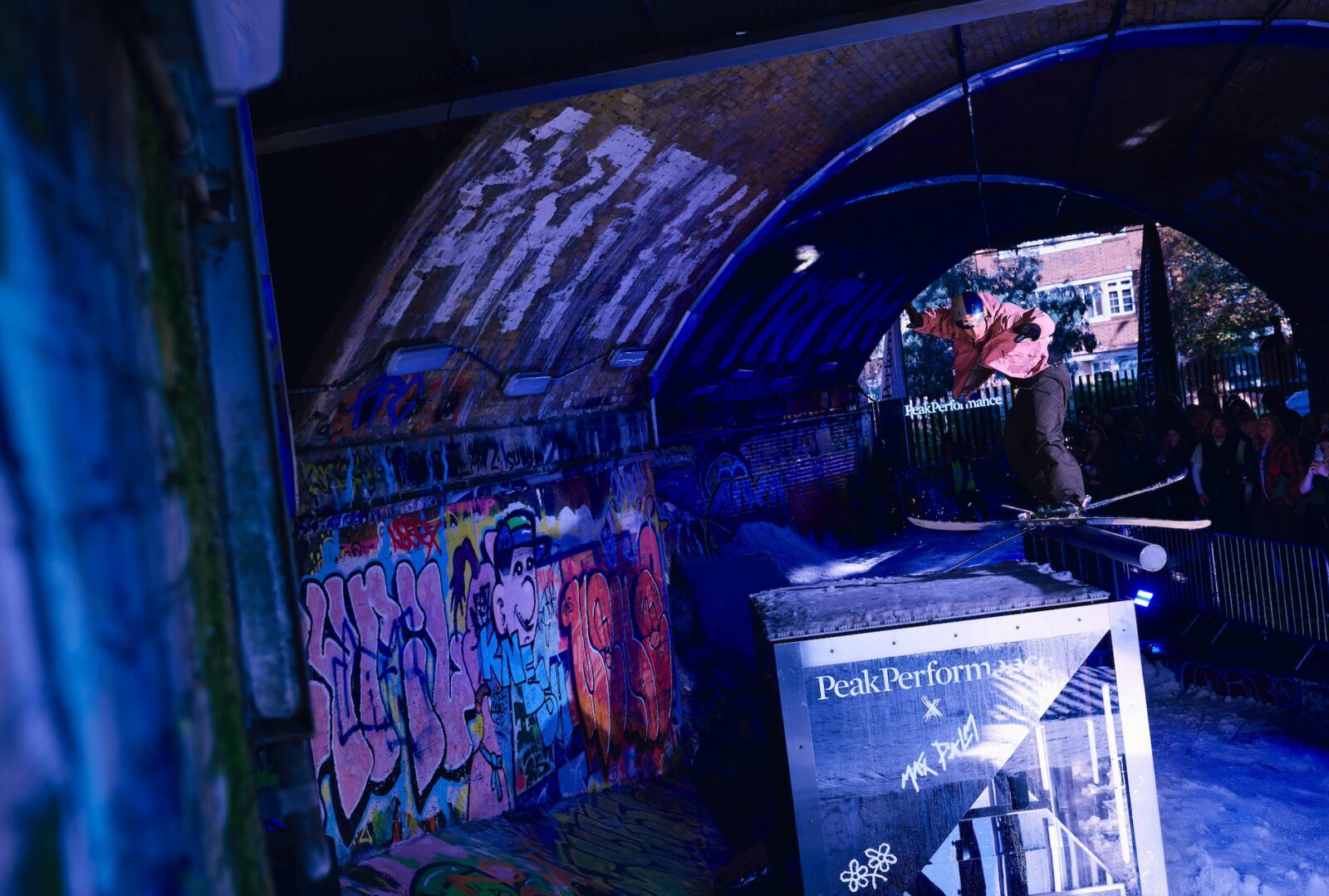 Over the weekend, Peak Performance transformed the iconic White Grounds Skatepark into a freeski hub. Under the graffitied brick arches of London Bridge train station—thick with layers of paint and skate history—the space witnessed its first ski event. To celebrate the release of Max Palm’s signature collection, Peak Performance filled the skate park with real snow, built a custom “ice cube” feature, and invited a bunch of Max’s friends and local UK rippers to shred.