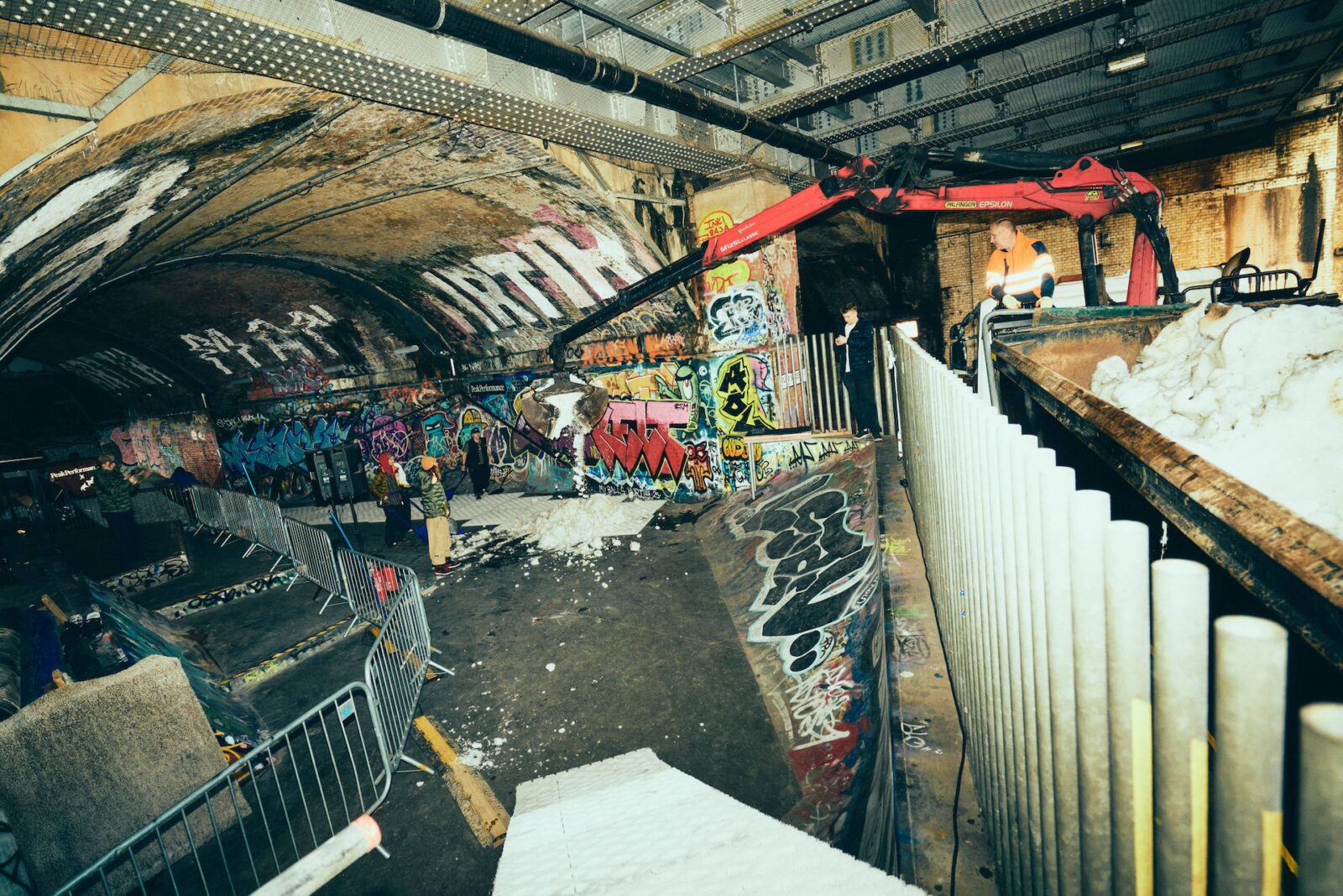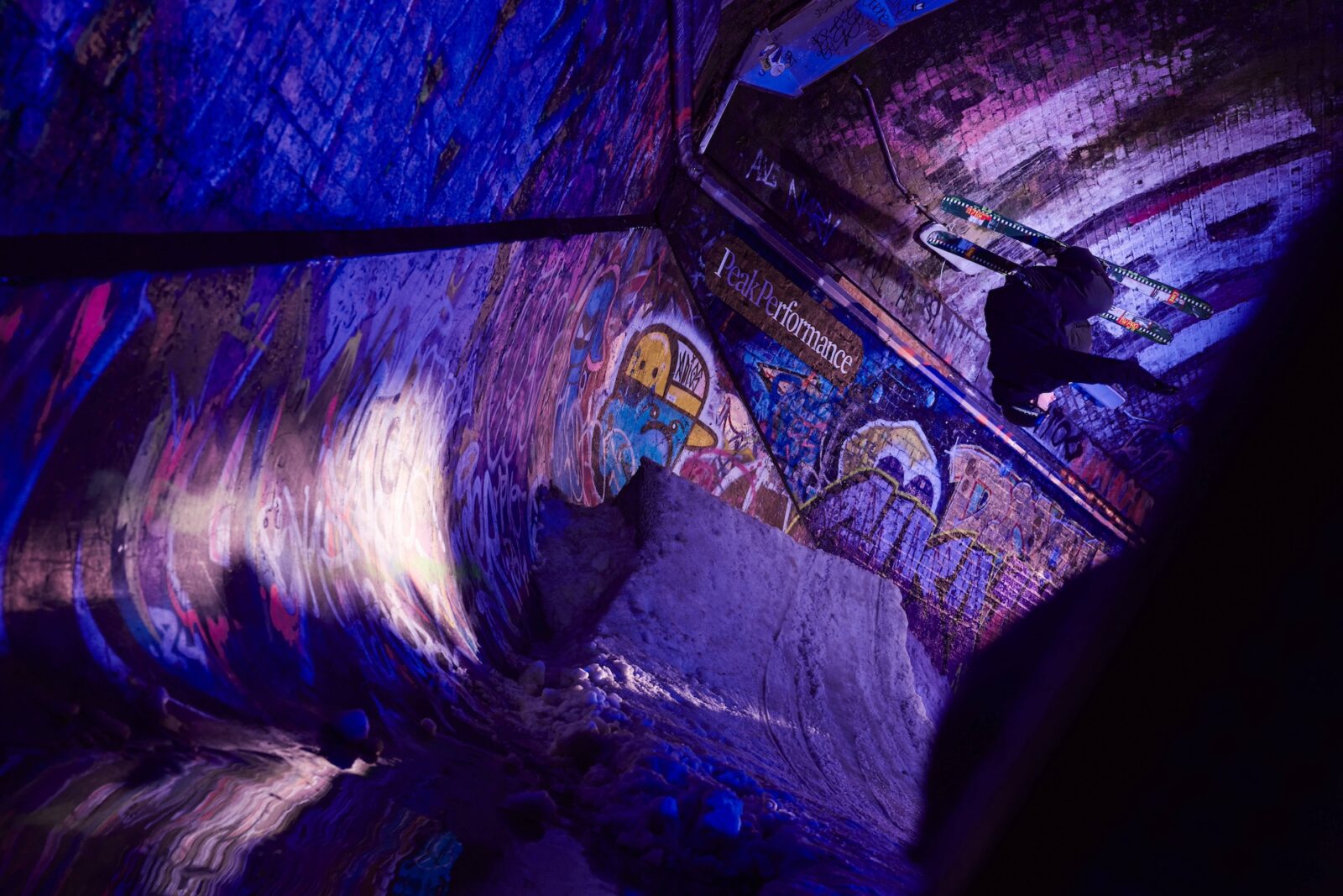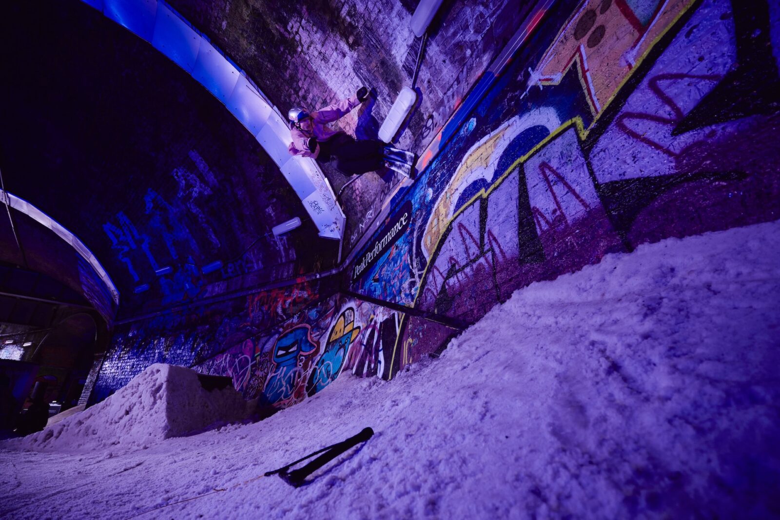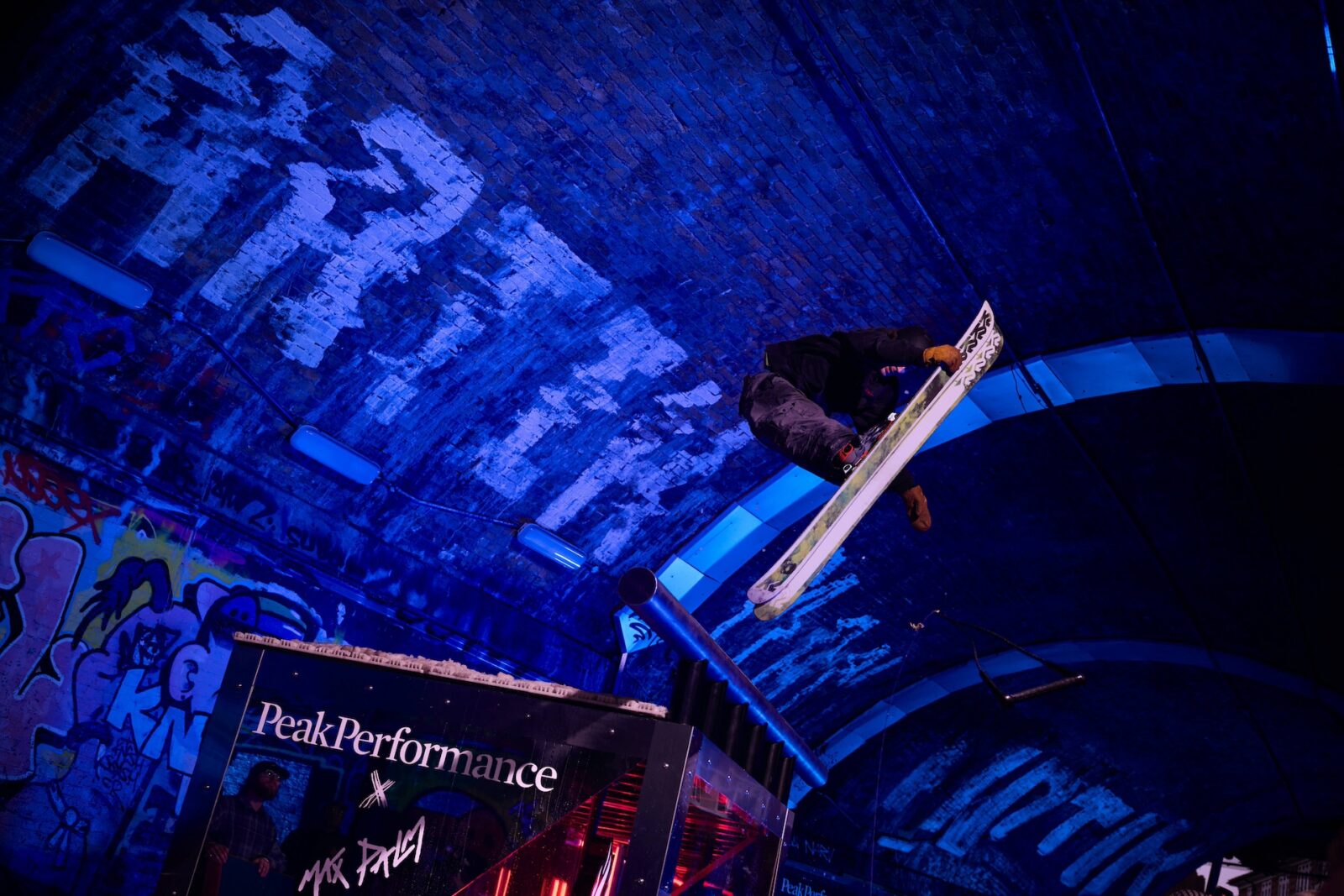 Over the weekend, Peak Performance transformed the iconic White Grounds Skatepark into a freeski hub. Under the graffitied brick arches of London Bridge train station—thick with layers of paint and skate history—the space witnessed its first ski event. To celebrate the release of Max Palm’s signature collection, Peak Performance filled the skate park with real snow, built a custom “ice cube” feature, and invited a bunch of Max’s friends and local UK rippers to shred.