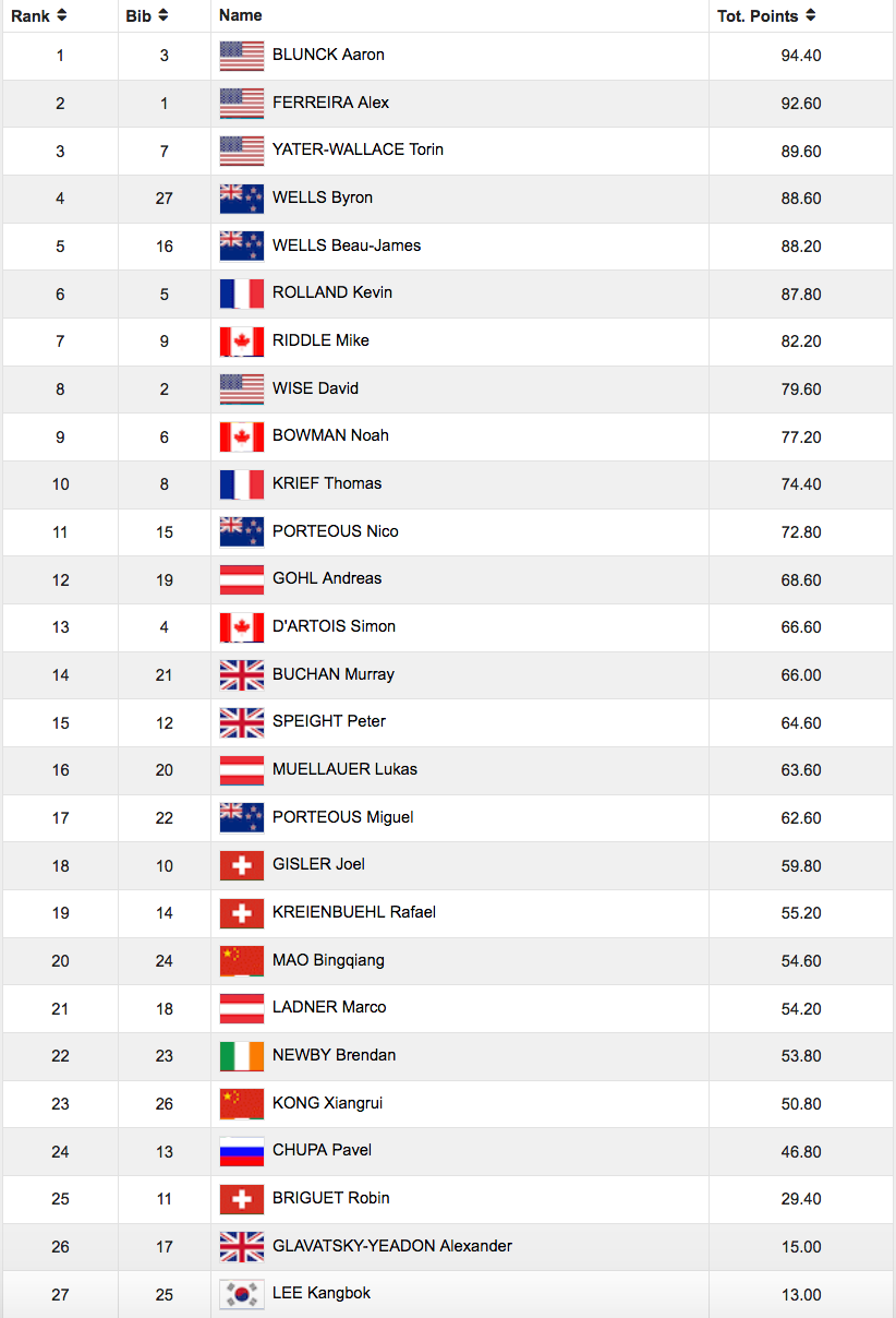 David Wise: pressure’s on. Opts for amplitude, going absolutely massive on his first-hit switch right 7. Gets the left 12, right 10, switch 7, right 9 double tail grab. Safety run, good for 79.6 and the finals. Whew. Kevin Rolland, happy with the results from run one, takes a cruiser lap. Ferreira takes it easy too Kreienbühl loses both skis on a dub 12; he’s done. Nico Porteous posts a 72.8, bumping D’Artois out of the top 12. Pavel Chupa screws up. Andreas Gohl, currently on the bubble, messes up the landing of his dub 12 and will have to wait and see.