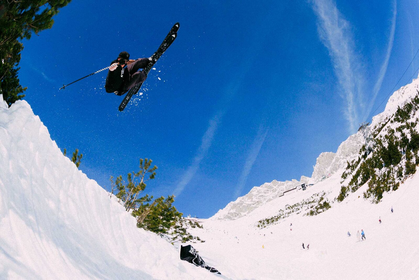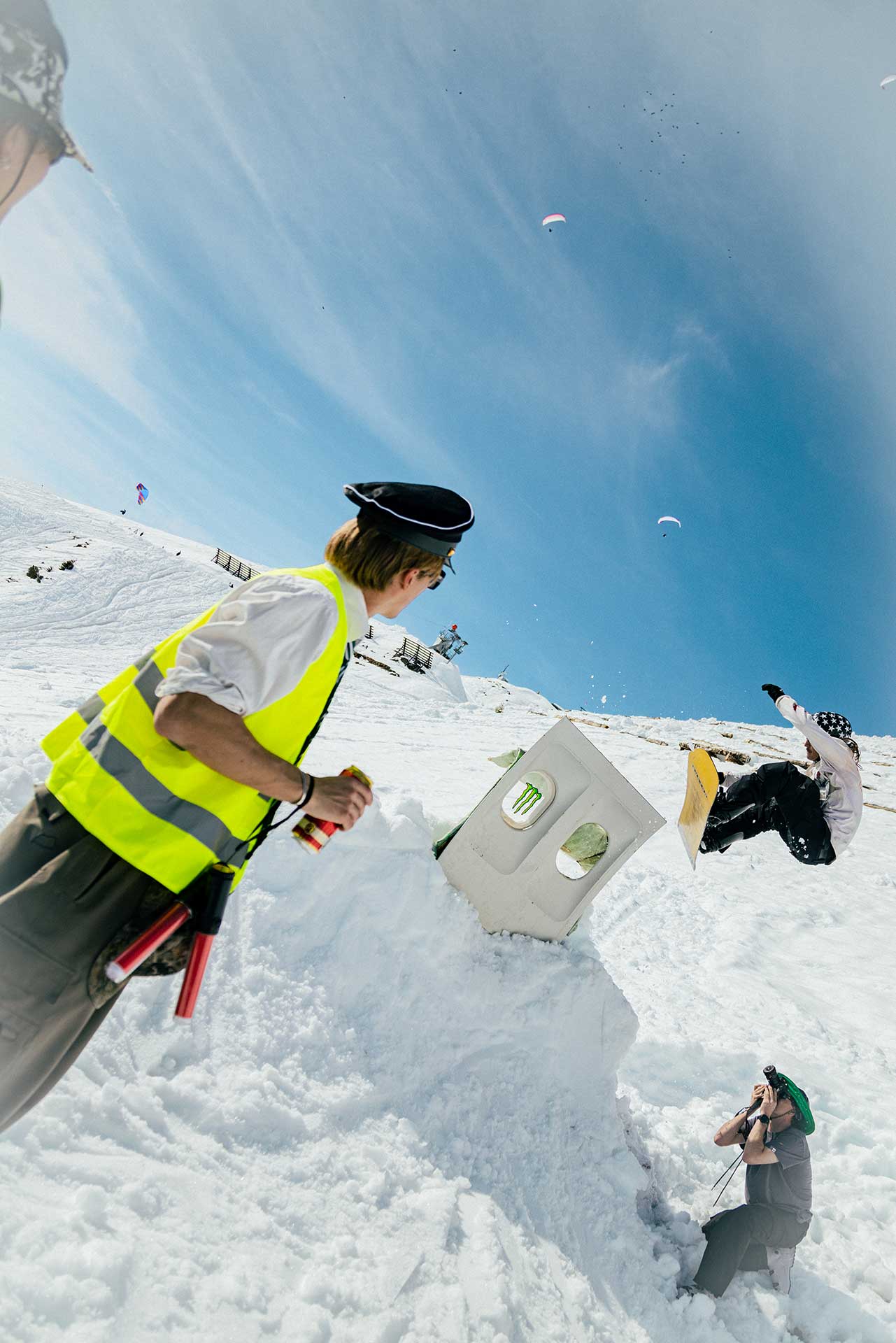 A perfect spring day with deep slush, blue skies and a million side hits ranging from mini to mega down the whole Dreierstützlift. The event started nice and mellow with a hike park up the top featuring a propeller and an airplane marshall. Further down the run, the Peanut Butter Club had set up some nice jumps next to a quarter pipe with a window seat with a view.