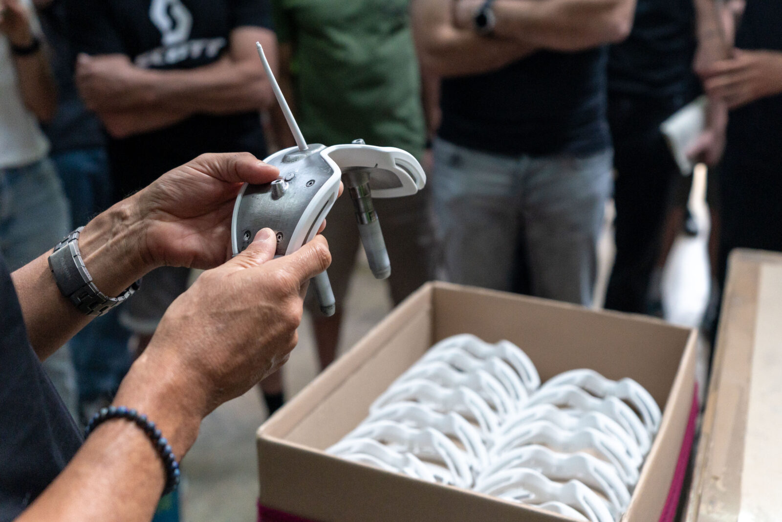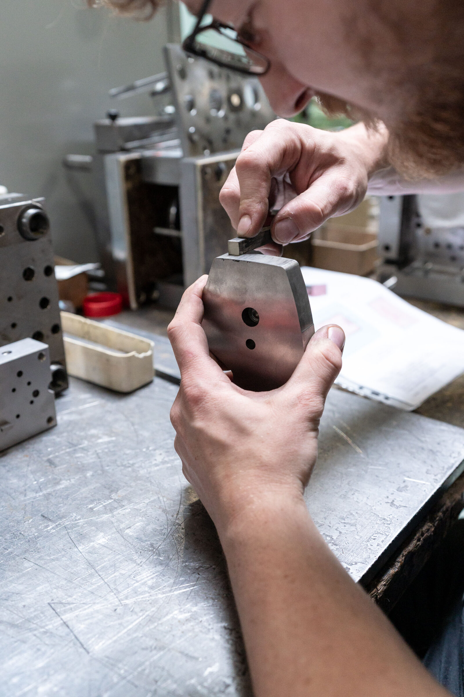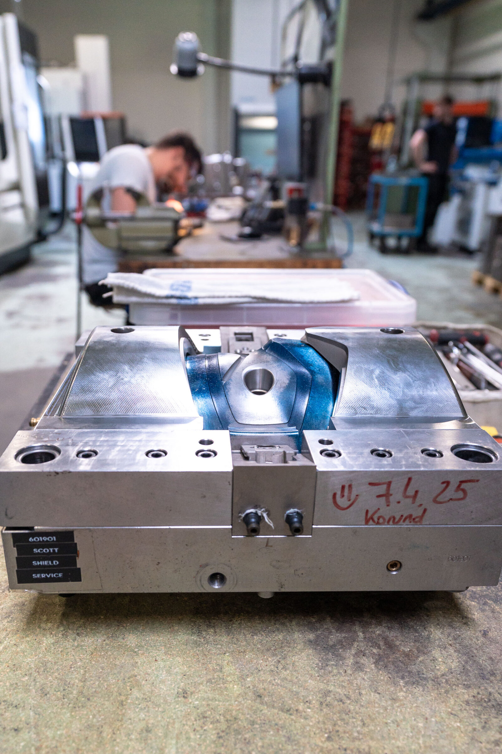 But let’s get started with the factory tour. At the beginning of production stands the most expensive and most time-consuming step. Like most plastic parts, goggle frames are made with injection molding. That means that molten plastic material gets injected into a hollow mold, where the plastic is cooled down into its solid state and the result is the final frame. Sounds simple, and it actually is in the final production process, when a frame takes about one minute per piece. You need the hollow mold, though, and that is what costs time and money. The molds are designed in CAD and then sculpted from metal, a process that is easier said than done due to the rather finely structured goggle frames. It’s a key competence of Scott GmbH and has been even before they started to produce goggles. In fact, a sister company still makes all kinds of plastic products for the automotive or the medical industries. But at Scott GmbH, the focus is exclusively on goggles for the Scott brand.