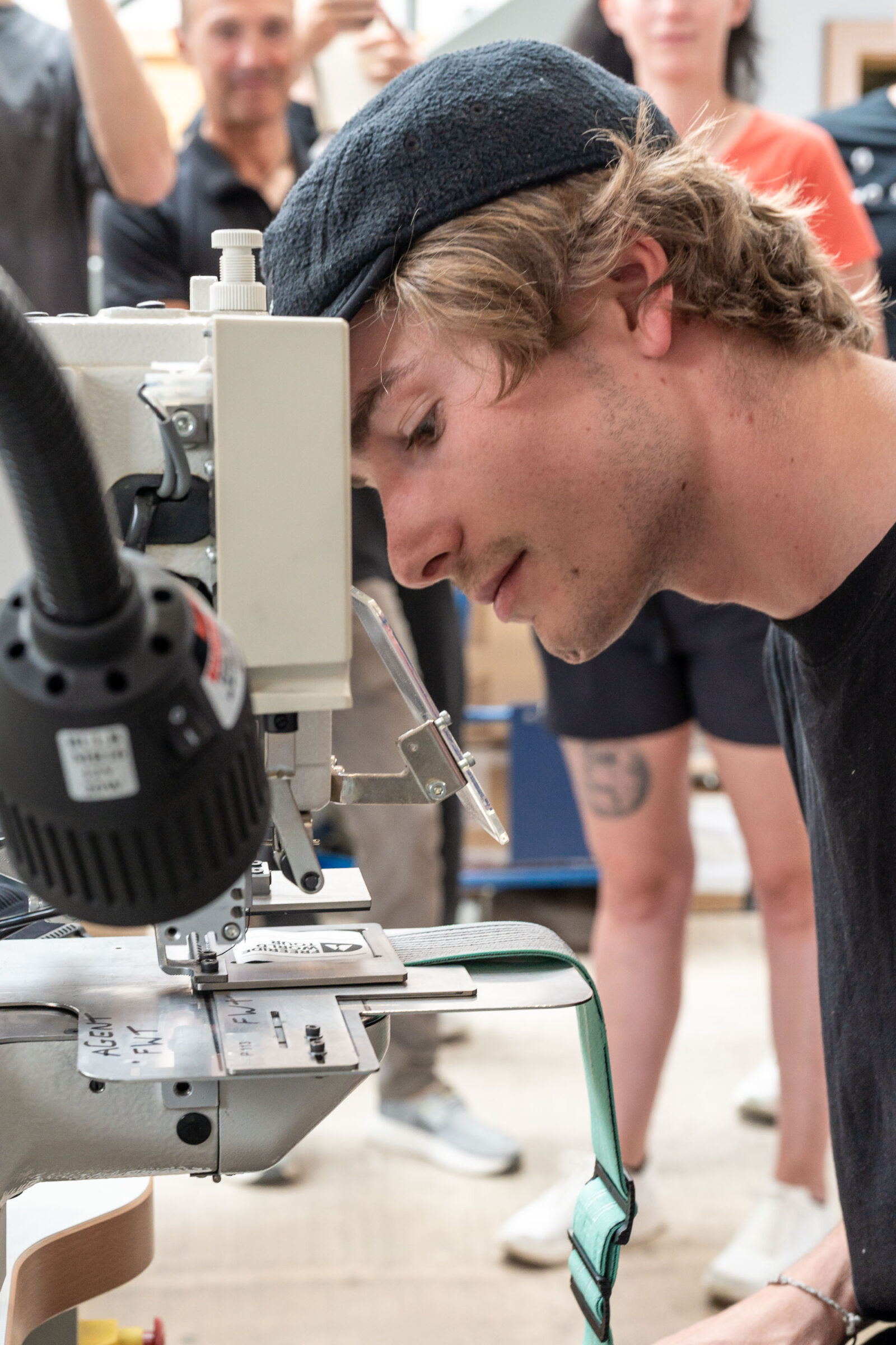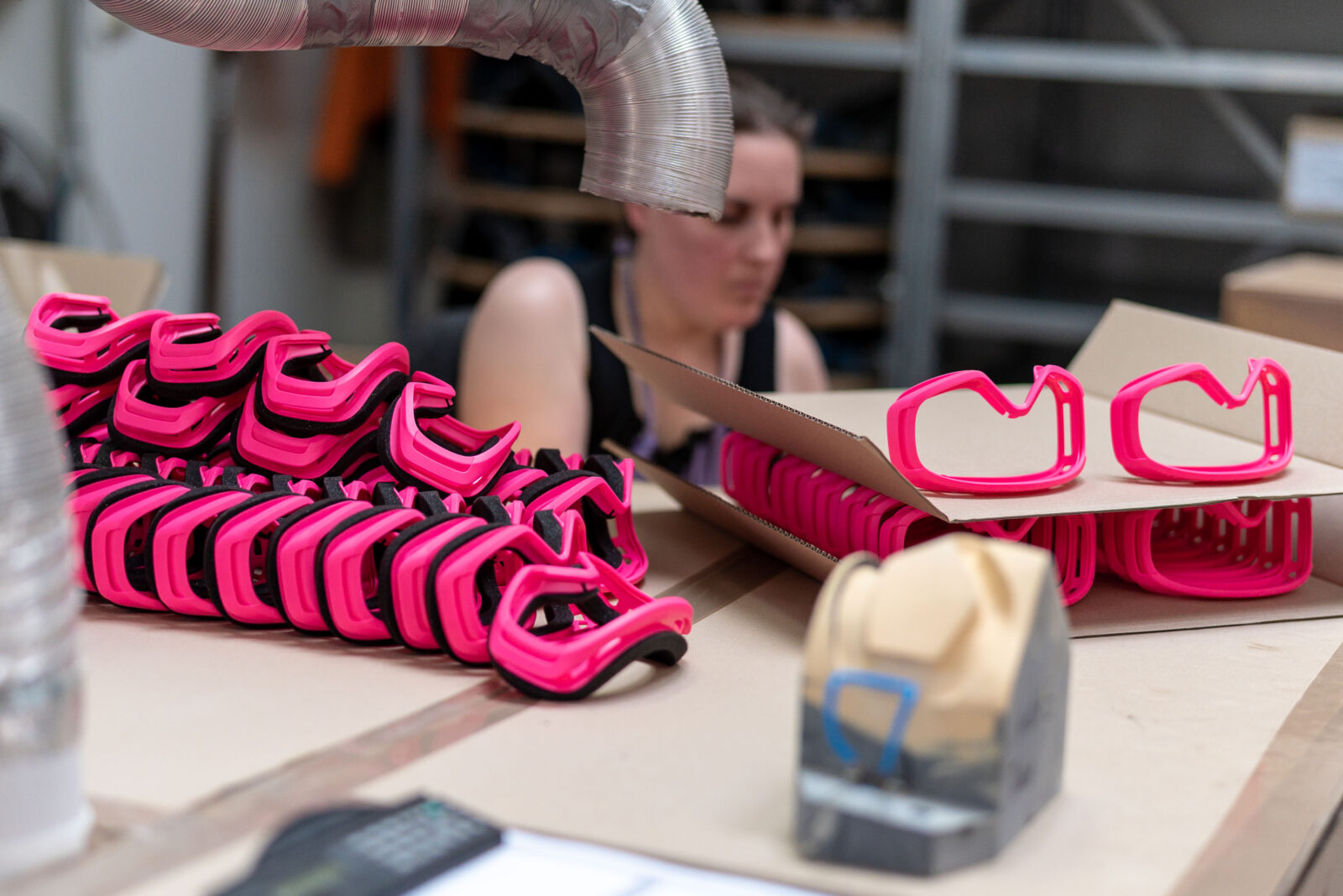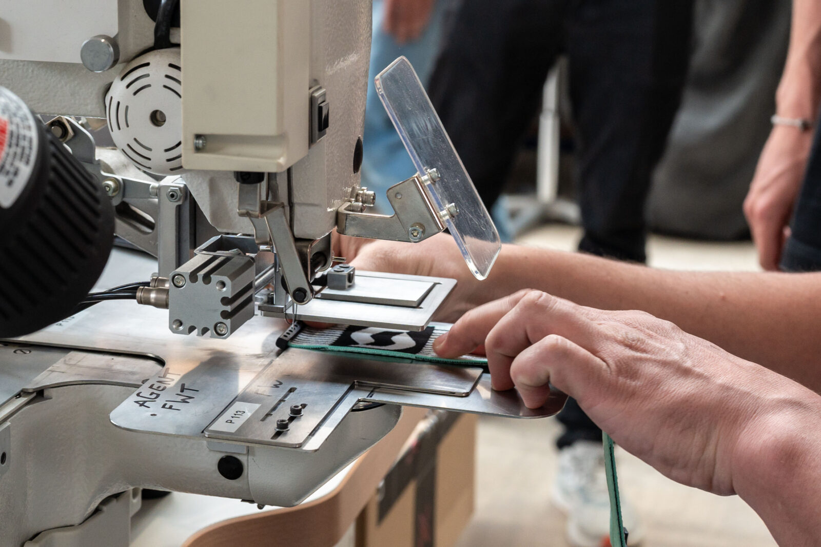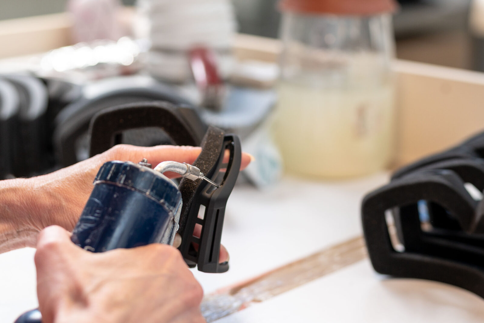 Once the goggle frame has been made, a lot of small steps need to be taken in order to get a pair of goggles as we know it, and most of these steps involve crafted handwork. For example, foam needs to be glued to the frame, both where the frame touches the face and where ventilation needs to be covered. Due to the finely sculpted forms of goggles—different from model to model—these processes cannot easily be automated. The number of goggles produced is simply not high enough to make the investment in the required machines profitable. The same goes for the process of cutting and sewing the goggle straps, not to mention threading the straps to the frames.