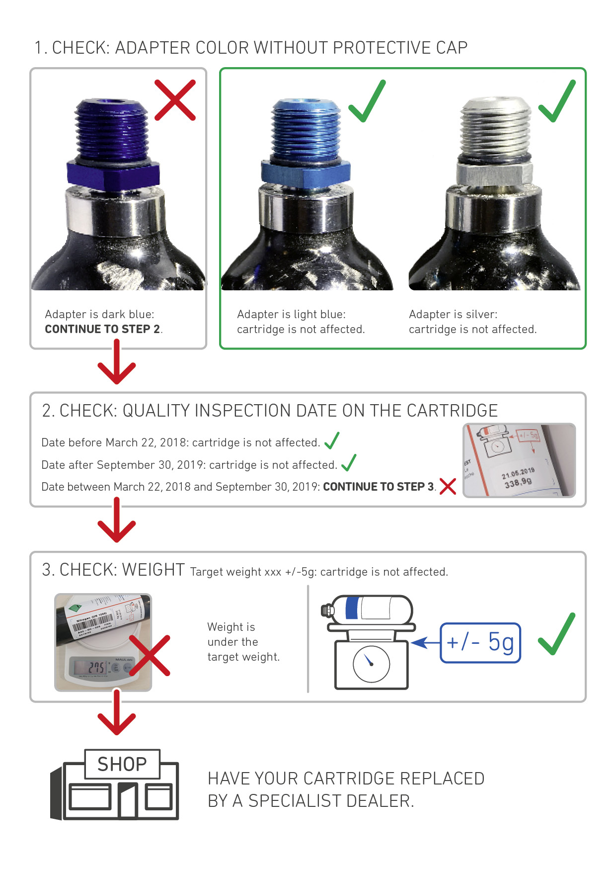Cartridges with dark blue adapters and a quality inspection date between March 22, 2018 and September 30, 2019 may be affected.