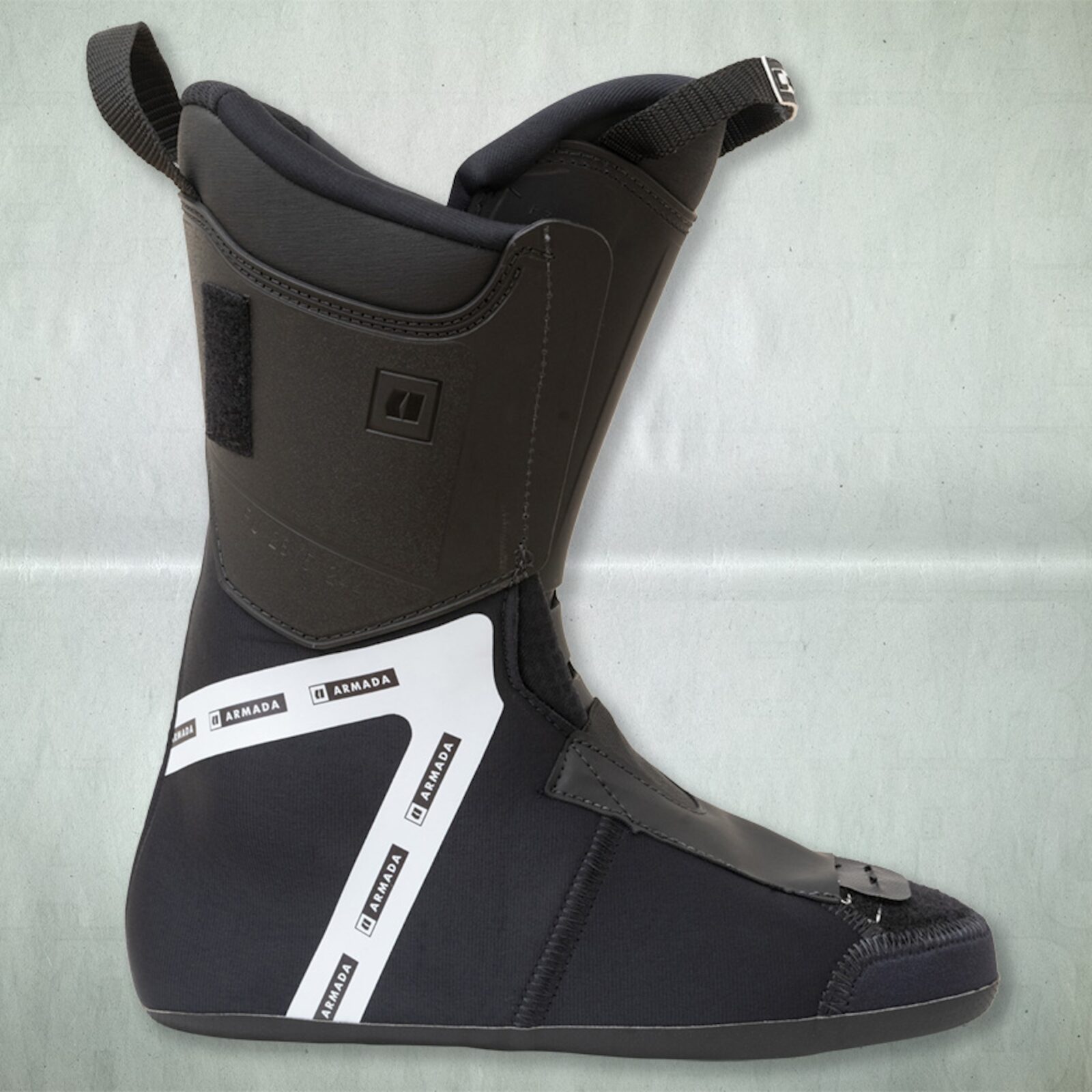 The high-back part of the lower shell is more similar to a two-piece boot. It combines with the tongue to give the boot its flex pattern. Armada