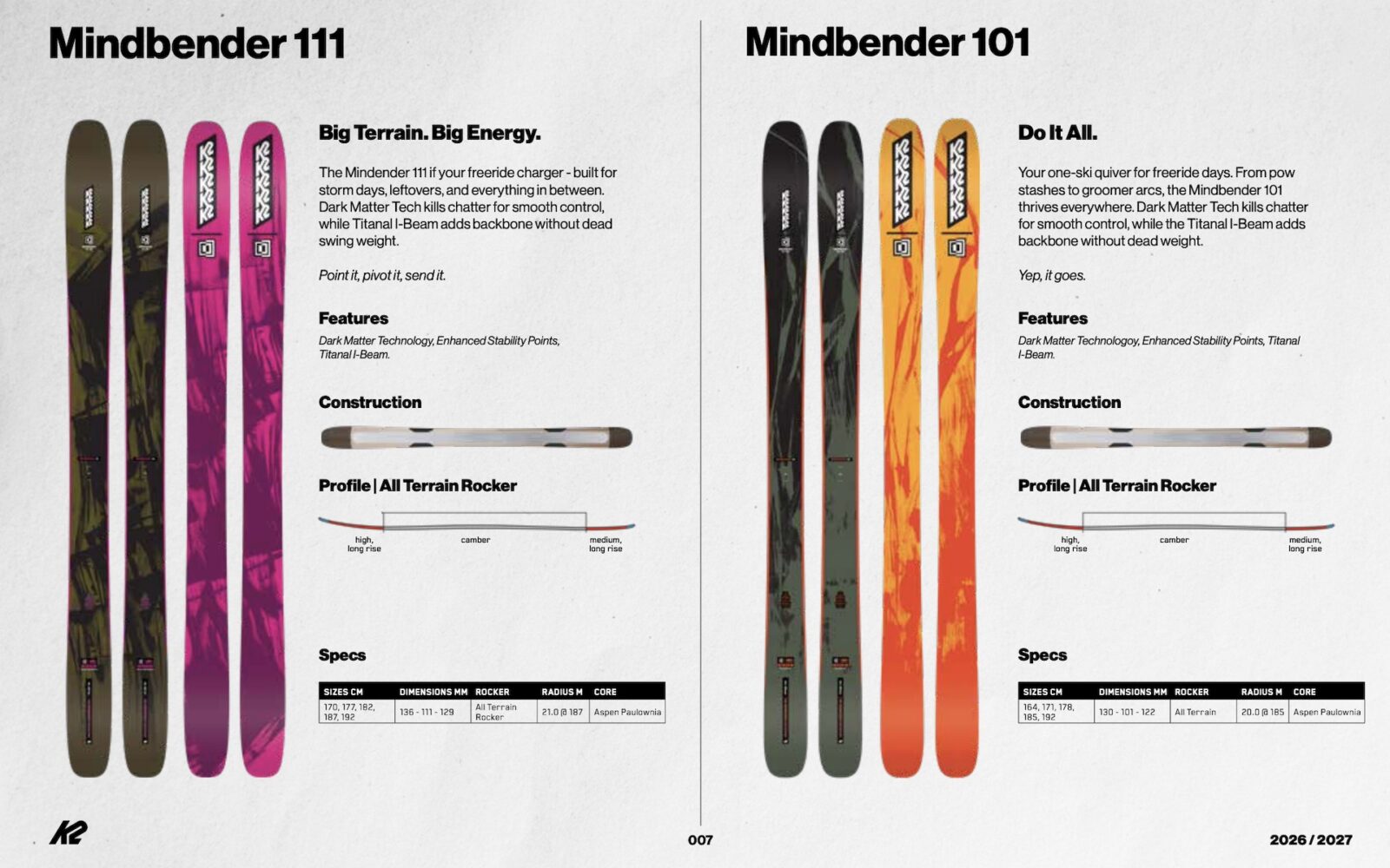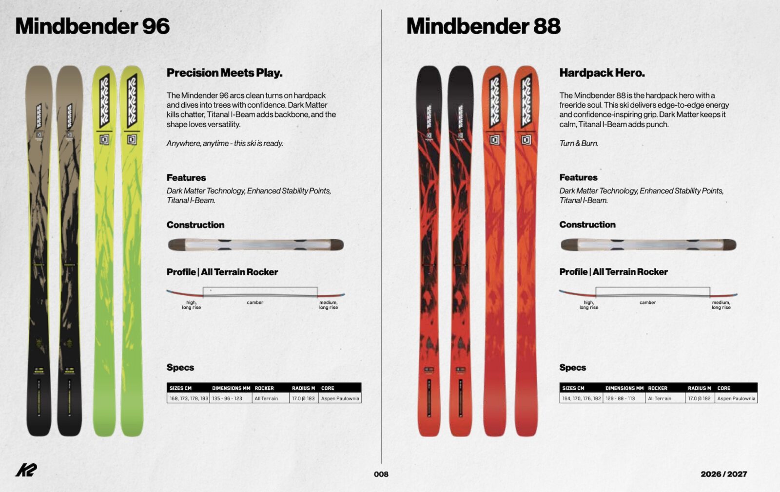 Dark Matter might sound like marketing fluff, but on paper it solves one of skiing’s oldest trade-offs: stability versus playfulness. The Dark Matter tech allows K2 to keep the Mindbender series lighter, less stiff and more playful while retaining stability and edge grip. If it skis the way it reads, the 26/27 Mindbender lineup could end up being one of the most balanced freeride collections out there—calm when things get hectic, but still very much alive underfoot.