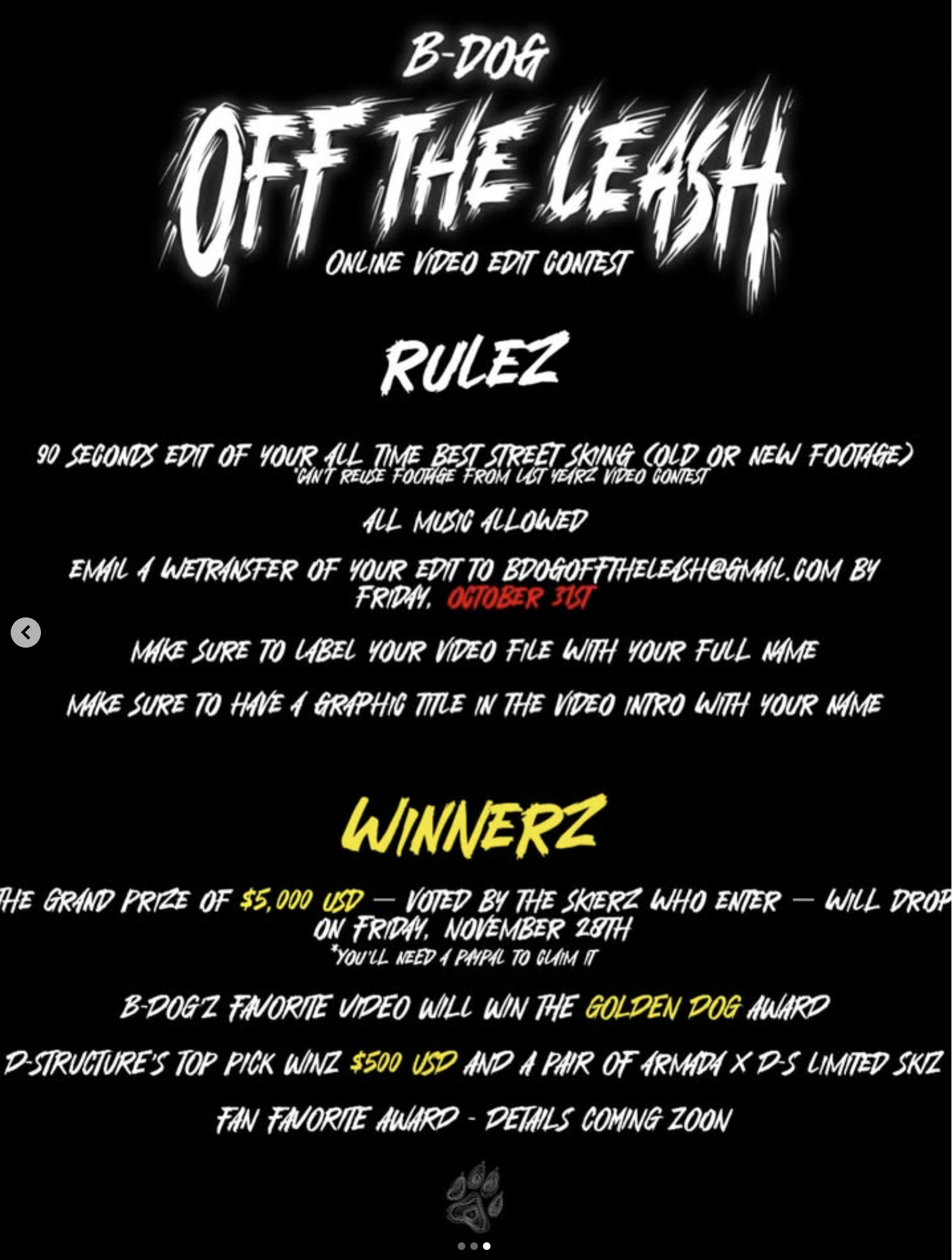 To enter, email a WeTransfer link of your video to bdogofftheleash@gmail.com. Make sure your video includes a graphic with your full name in the intro to the edit.